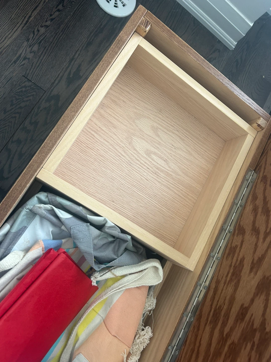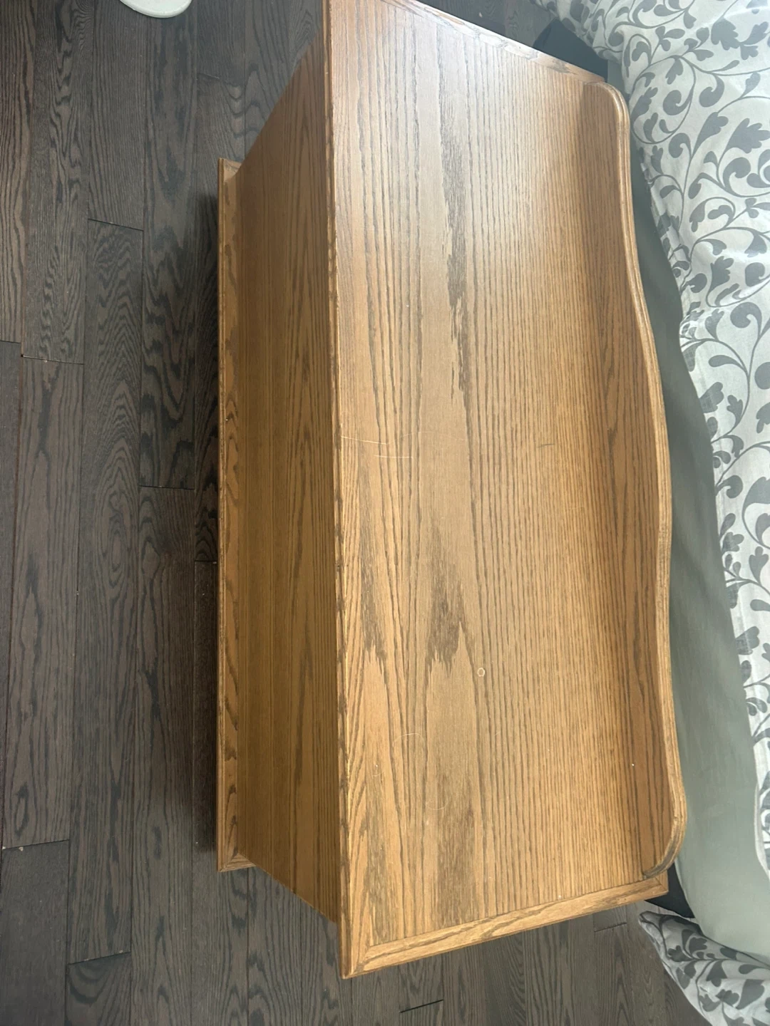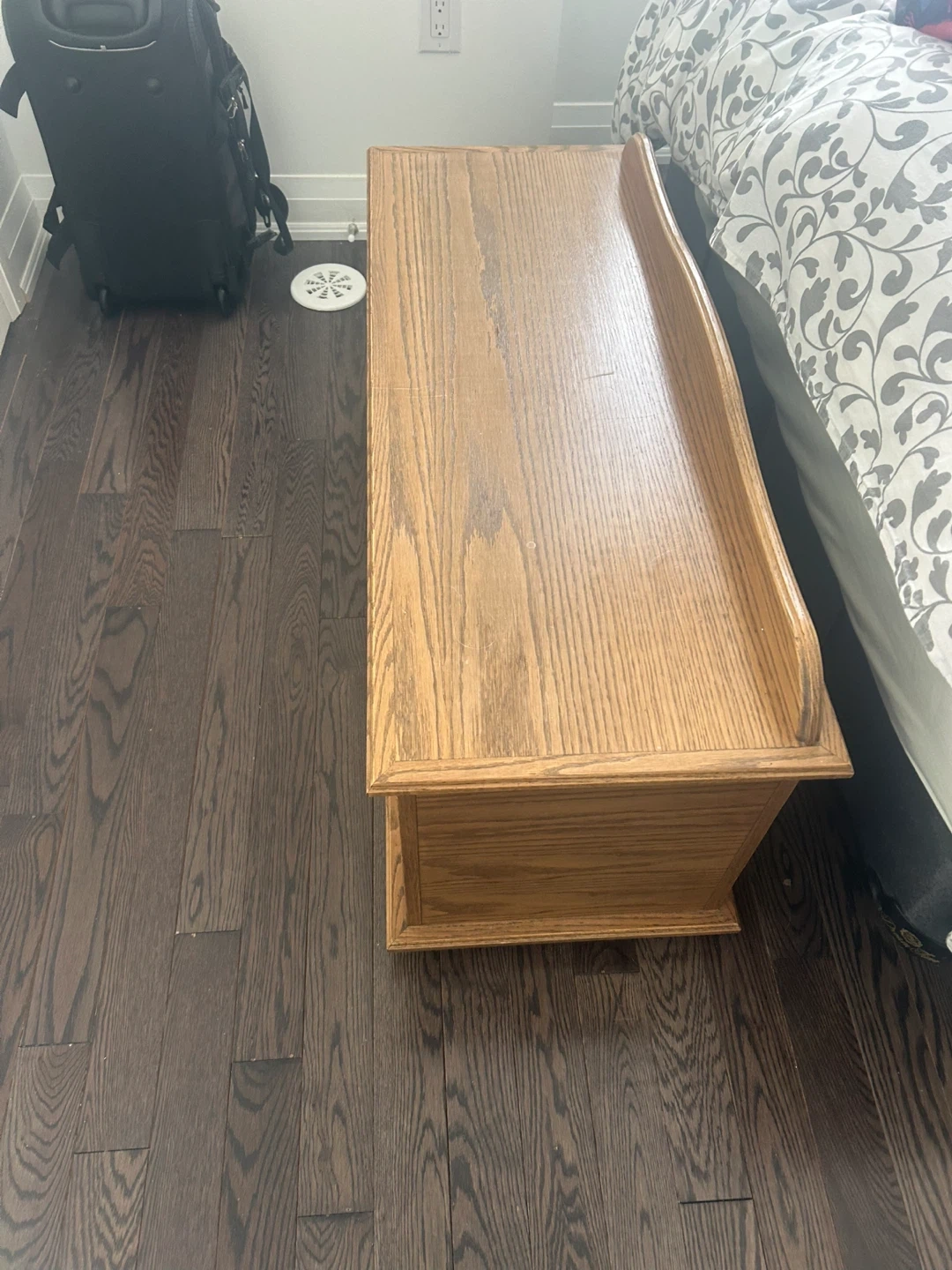 This wooden blanket box is made of oak veneer. It's perfect for storing blankets, linens, or other household items. The hinged lid provides easy access to the spacious interior.