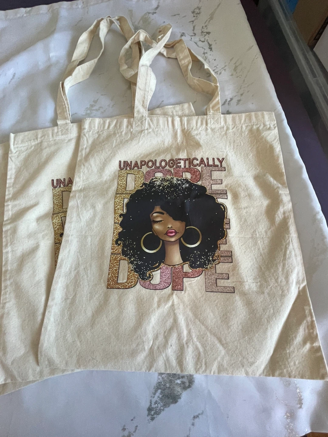 Canvas tote bag featuring a vibrant graphic print. This reusable bag is made of durable canvas material. It's a great accessory for everyday use! I have three. They are $5.00 each