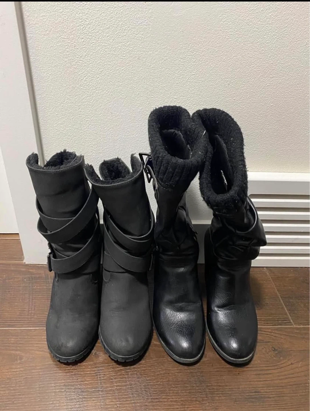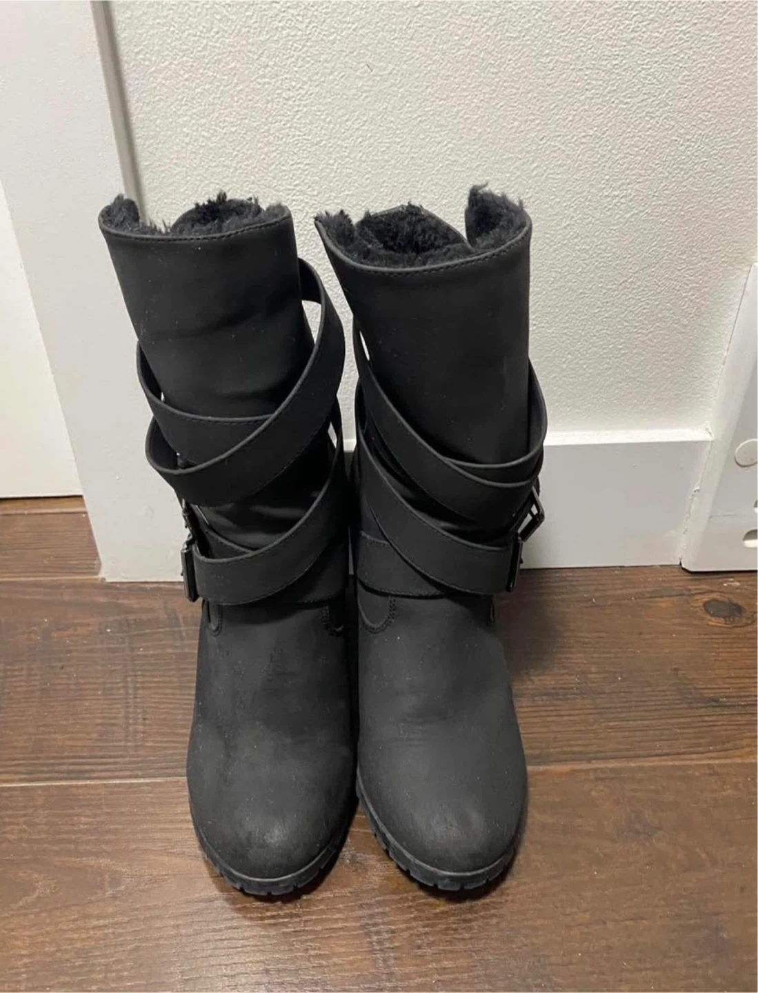 These Call It Spring wedge boots are black and a size 6.5. They feature buckle details and a faux fur lining. Perfect for keeping your feet warm and stylish during colder weather!