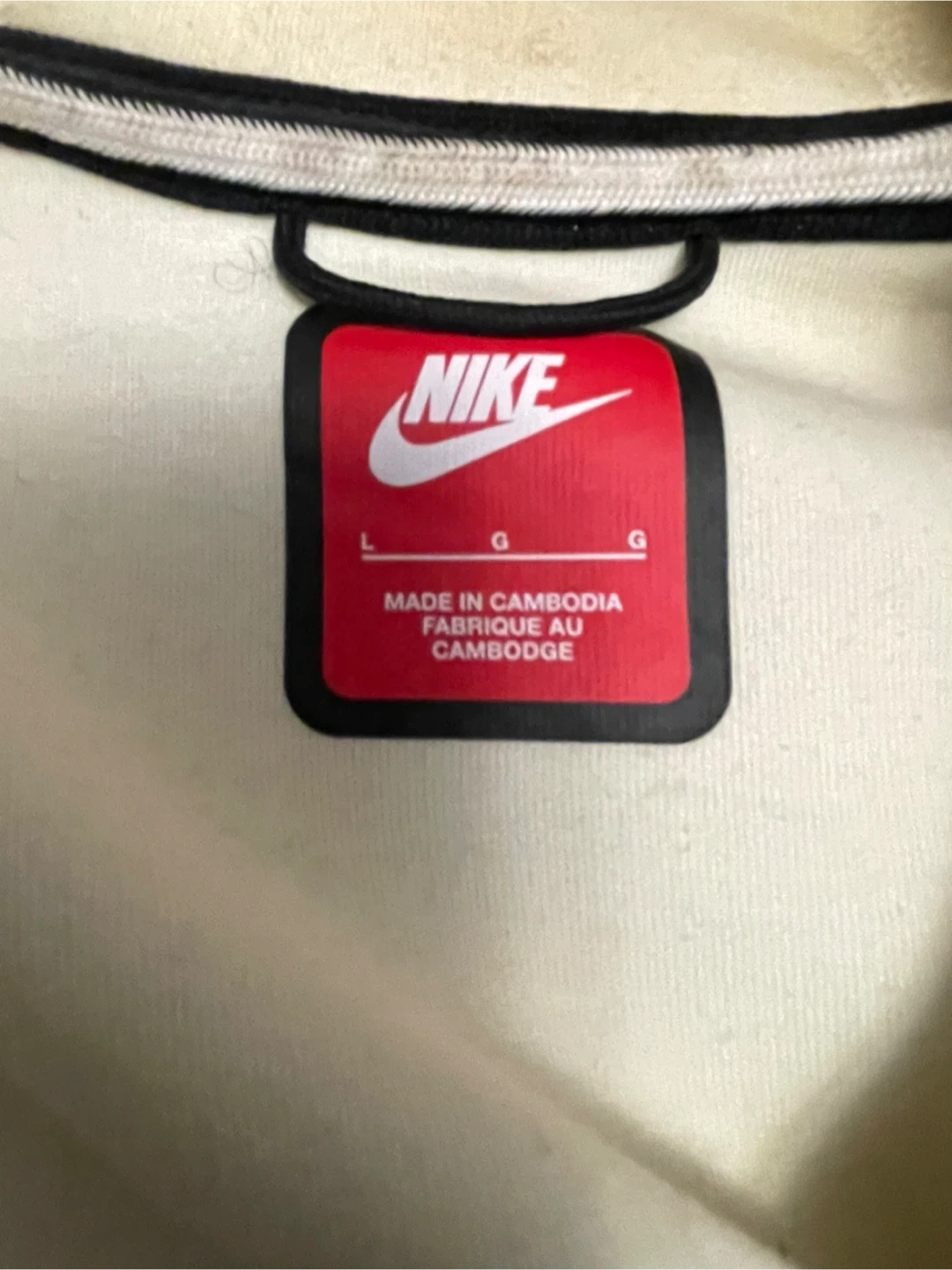 This is a Nike Tech Fleece full zip hoodie in a cream colour. It's a size large and made in Cambodia. It features a full zip closure and zippered pockets. The hoodie is in good condition only worn once and never wore it again because it didn’t fit me so yea it’s basically brand new and this is a unique colour no one really have this so please feel free to dm me if you interested