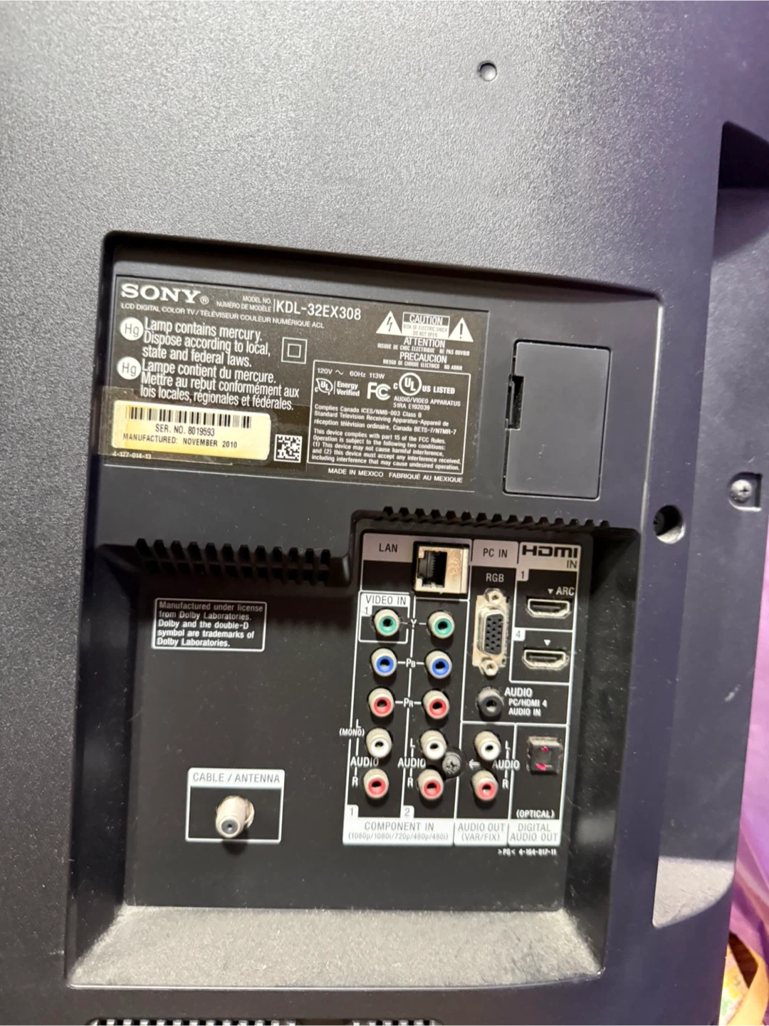 This is a Sony BRAVIA KDL-32EX308 LCD TV. Manufactured in November 2010. It's a 32-inch screen. This TV is great for bedrooms or smaller living spaces!