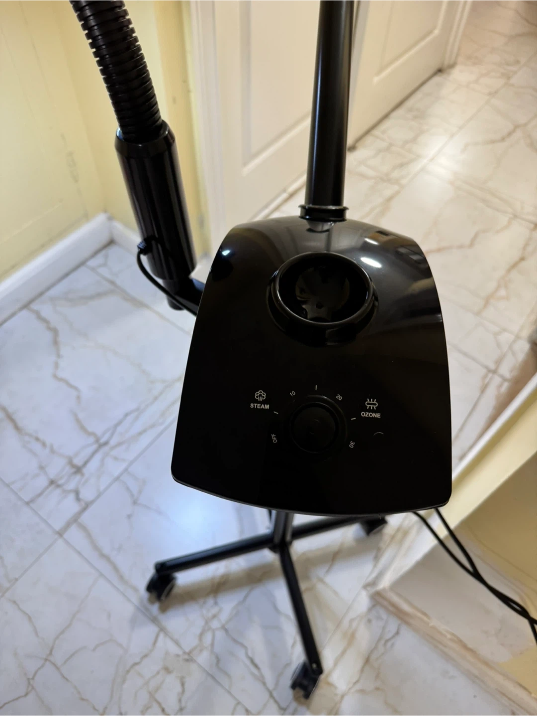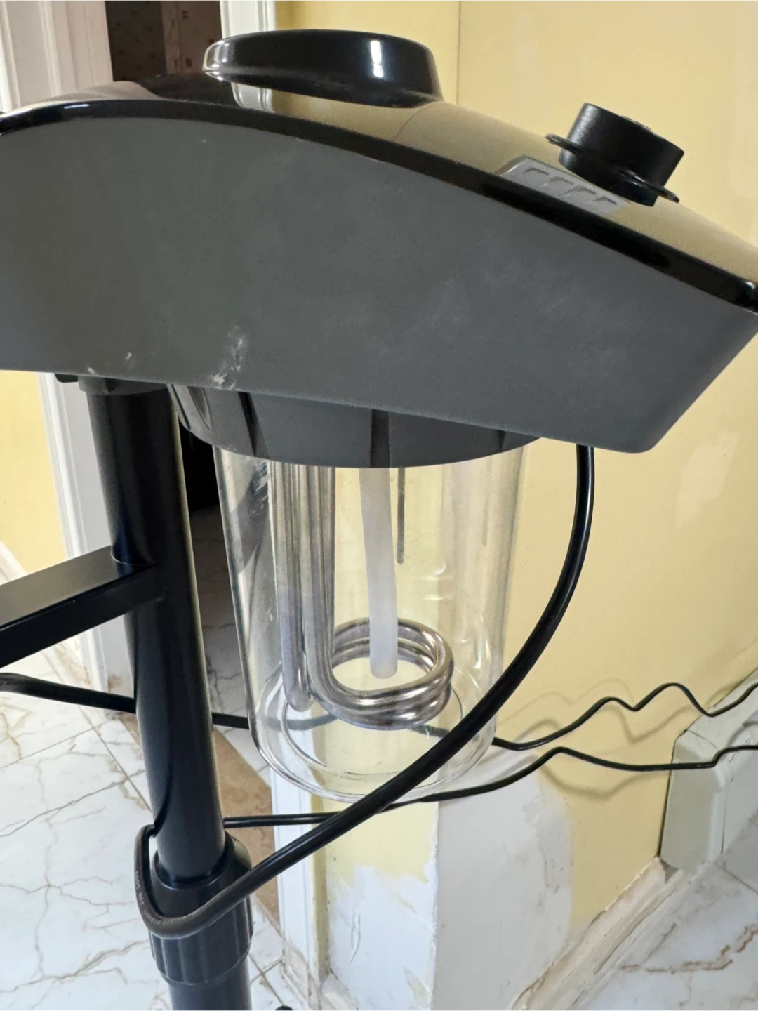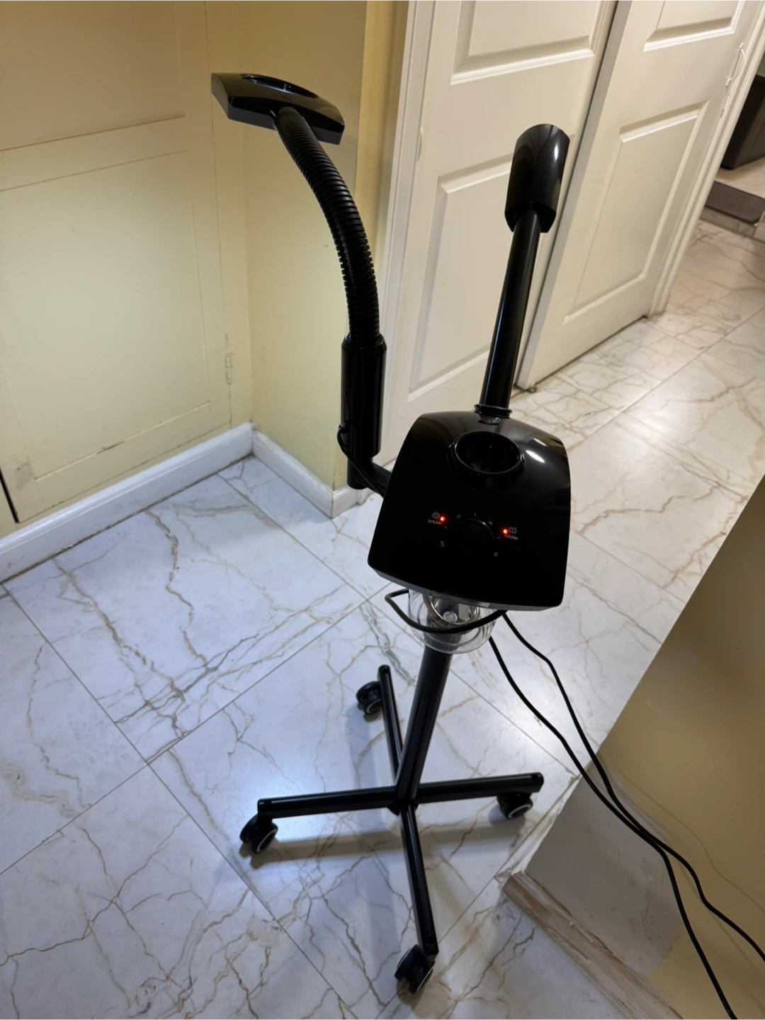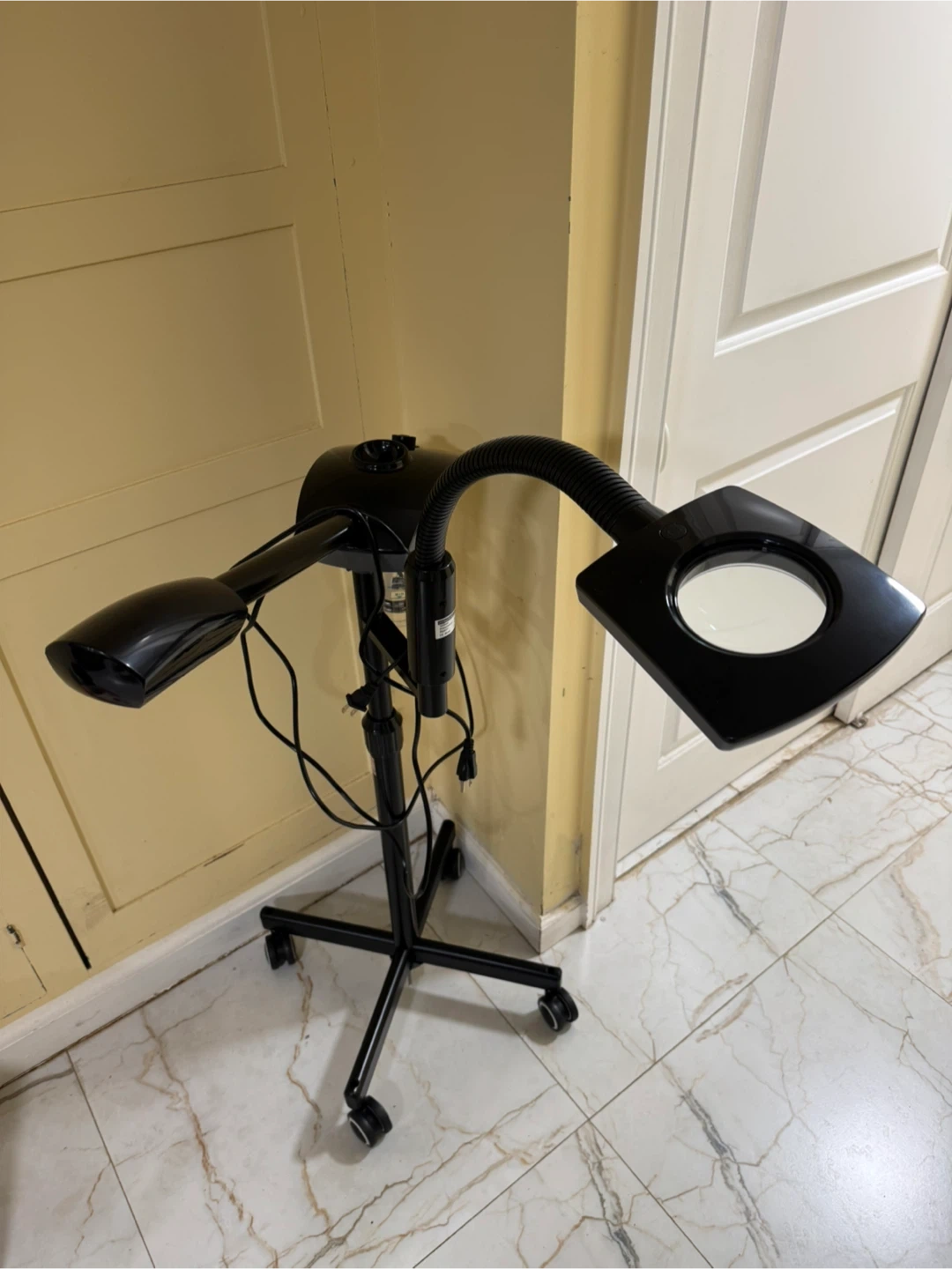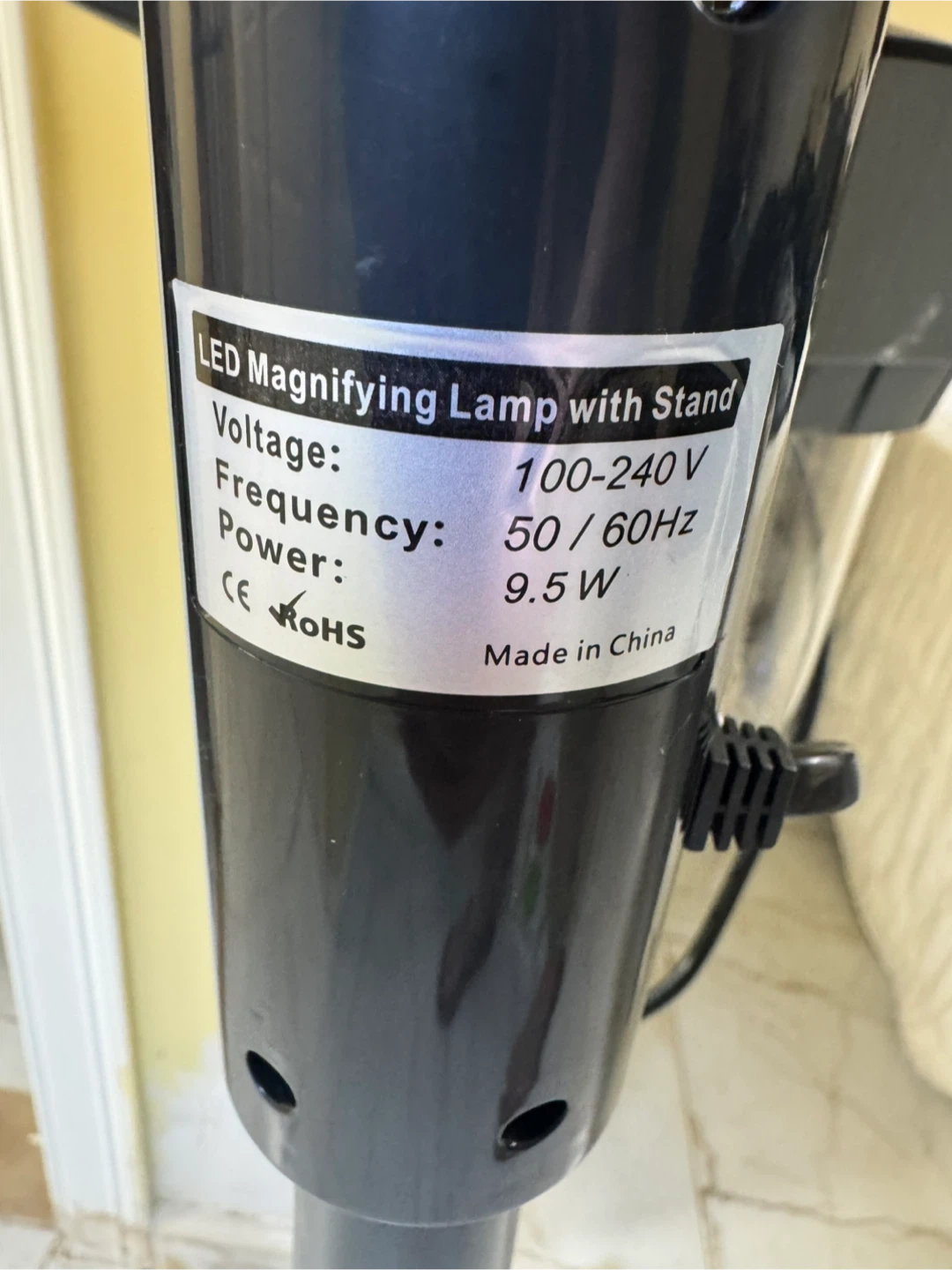This is an LED magnifying lamp with a stand. It's black and has a flexible gooseneck. Power is 9.5W and voltage is 100-240V. Made in China. This could be useful for detailed work or hobbies.