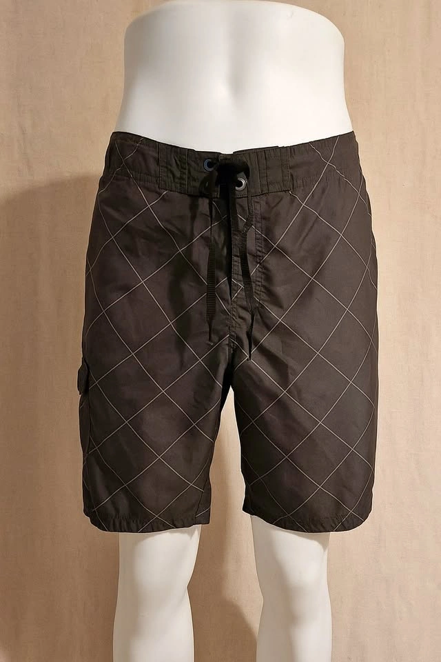 60Stylish gray board shorts with a subtle white grid pattern and side cargo pocket. Lightweight quick-dry fabric, secure drawstring waist, and mid-length fit — perfect for swimming, lounging, or beach days. Excellent condition, clean and ready to wear.