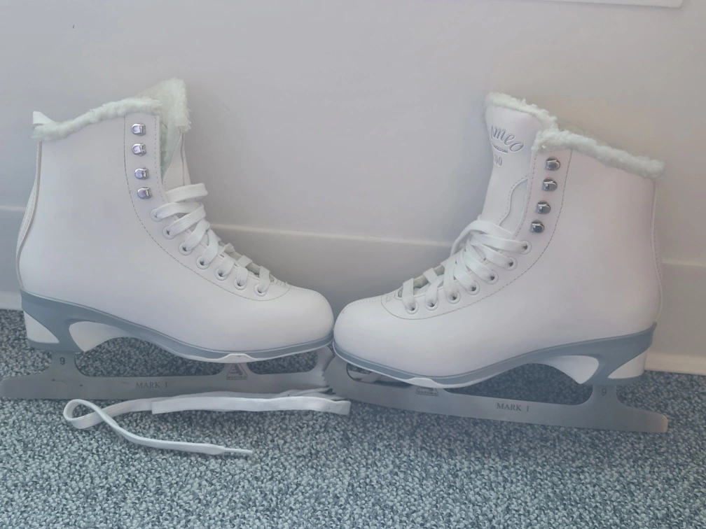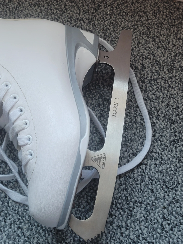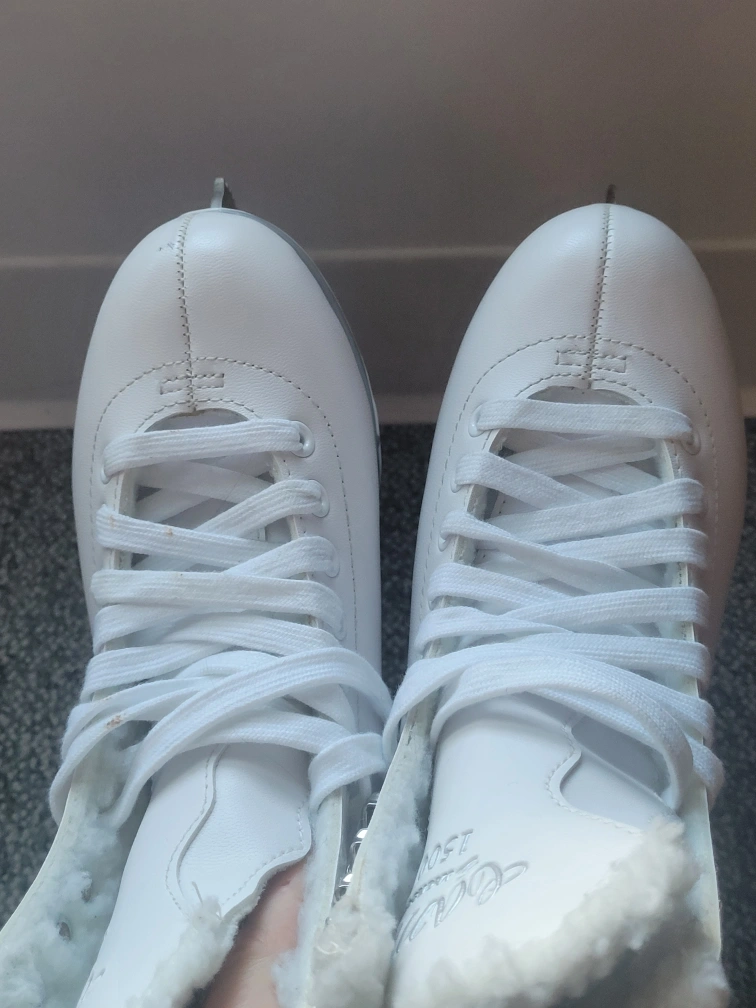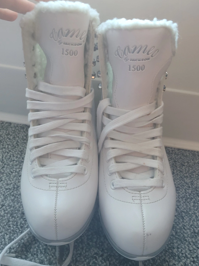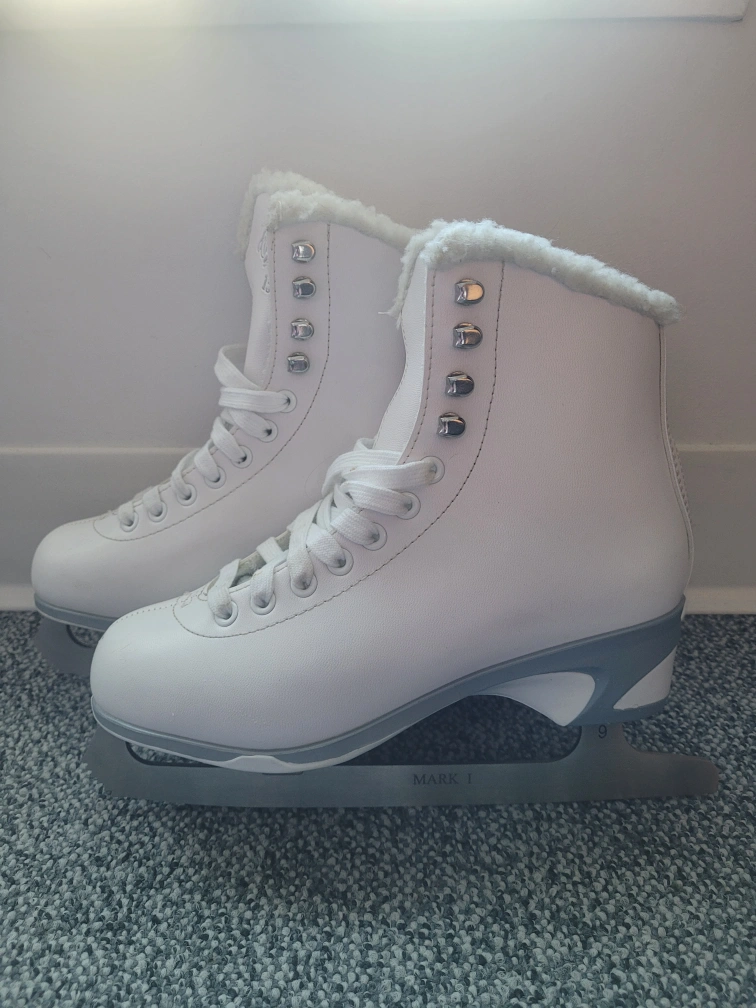 37- White figure skates with faux fur lining - Size 5. - only worn a couple of times before I transitioned to hockey - blades are sharpened