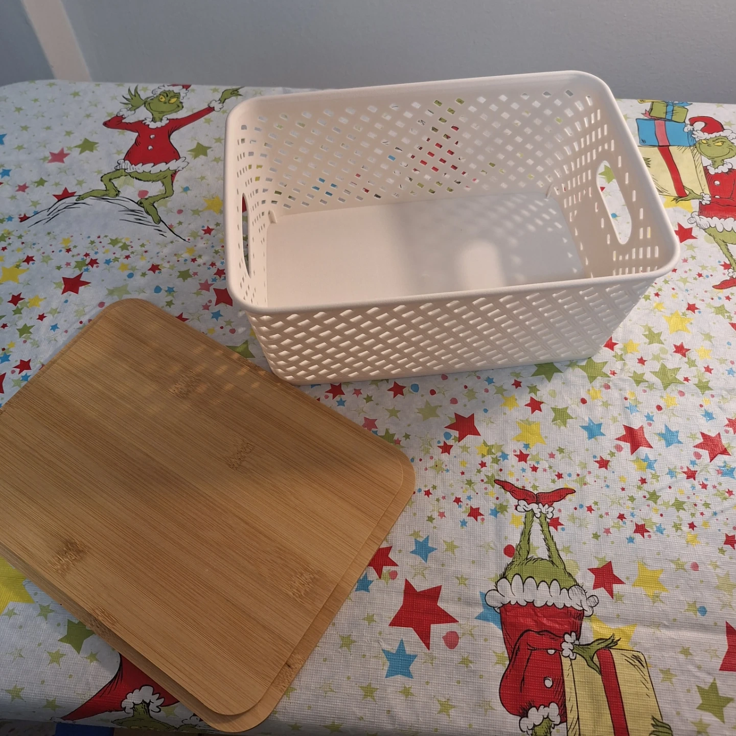 Keep your space tidy with this cream white plastic storage basket! It comes with a stylish bamboo lid. It's ventilation-friendly and stackable, making it perfect for any room. The dimensions are approximately 10.02" x 7.19" x 4.24".