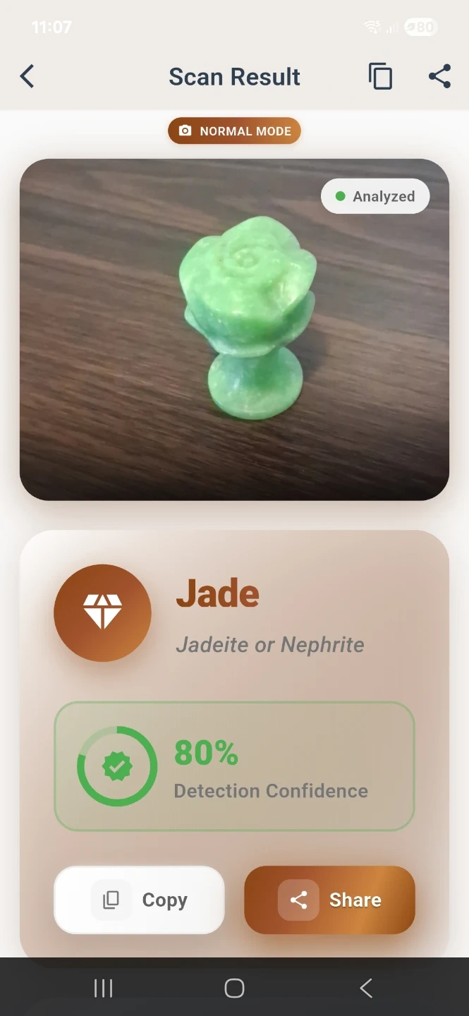 493Rock Identifier: Jade Type: Metamorphic Hardness: 6-7 Color: Green Streak: White Luster: Vitreous to waxy Specific Gravity: 2.9 to 3.0 Crystal System: Monoclinic (Jadeite) / Various, cryptocrystalline (Nephrite) Formation: Forms in metamorphic rocks under high pressure and relatively low temperatures. Common Uses: Jewelry, carvings, and ornamental objects. Interesting Facts: Highly valued in many cultures, particularly in East Asia. Considered a symbol of purity, serenity, and good luck. Related Rocks: Serpentine, Nephrite, Jadeite