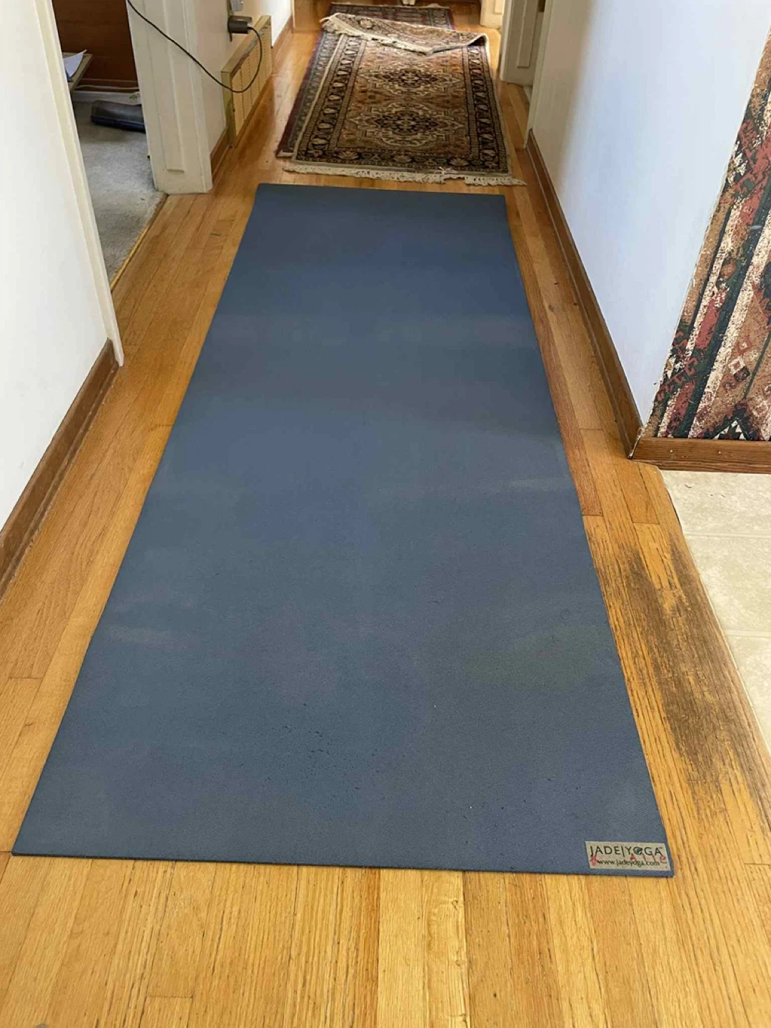 JadeYoga mats are made with natural rubber Known for optimum grip and cushion, and made without PVC or other synthetic rubbers Good quality brand Portable, easy to carry and pack away Some wear and tear on the mat but still usable 66 inches long 24 inches wide