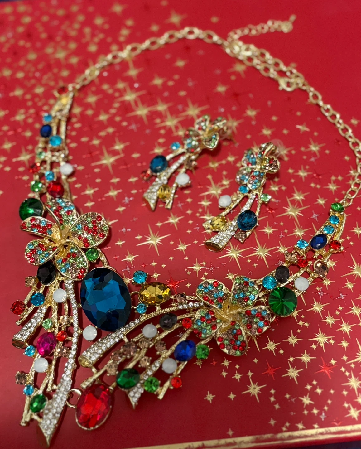 Sparkling multi-coloured rhinestone necklace and matching dangle earrings. Set features floral accents and a large central blue gemstone. Great for any events!