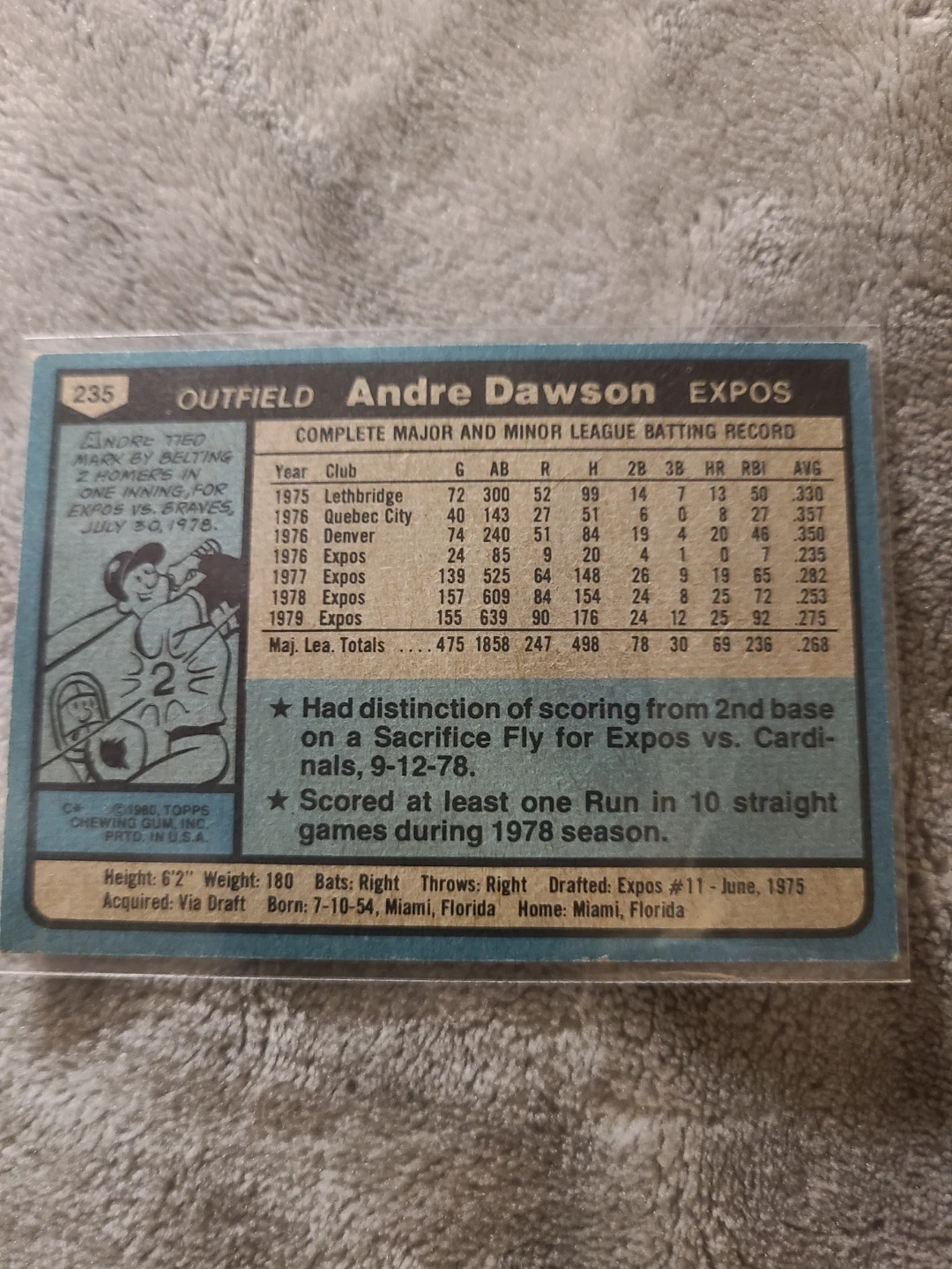 This is a 1980 O P Chee Andre Dawson baseball card. It's from the 'EXPOS' set and features his batting record. Card number 235.