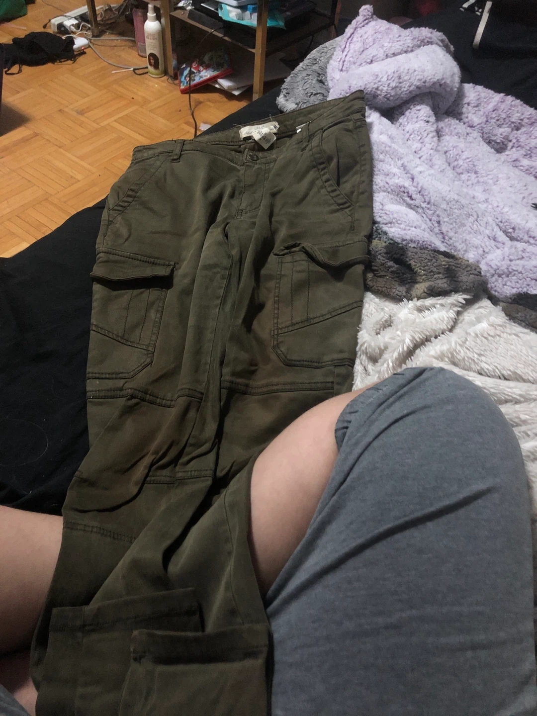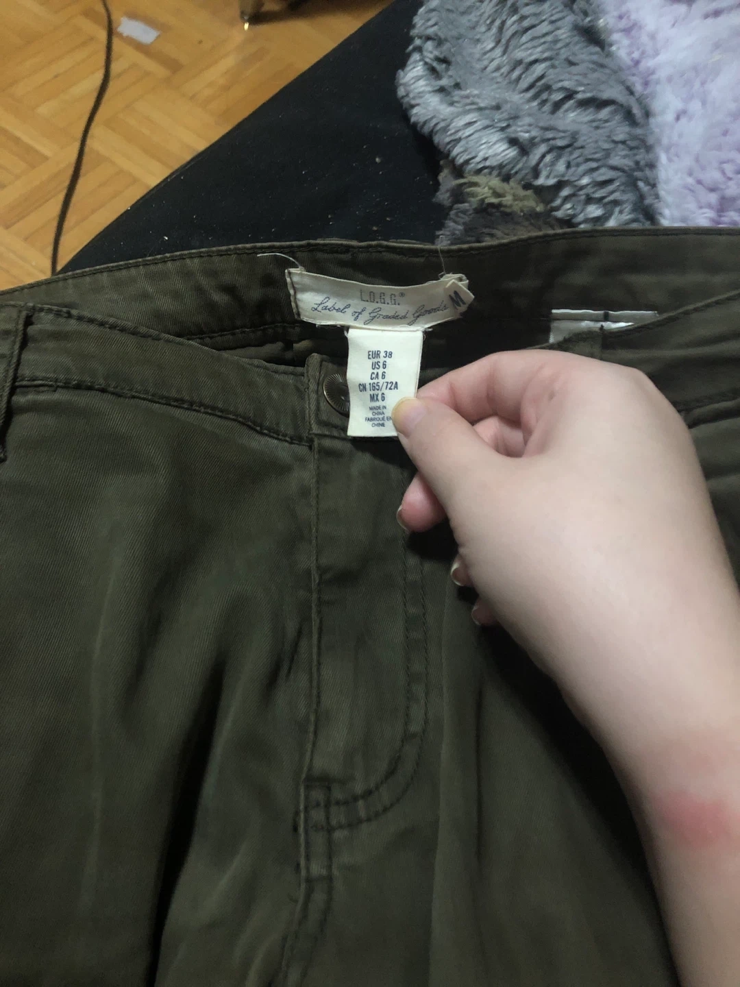 Selling a pair of L.O.G.G. cargo pants in olive green. They are a size 6 (CA size). The shell is made of 58% lyocell and 40% cotton, with 2% elastane. The pocket is 100% cotton.