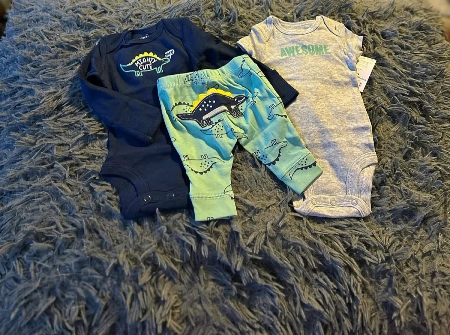 This Carter's outfit set features a navy long-sleeve bodysuit with a "Mighty Cute" dinosaur graphic and a grey short-sleeve bodysuit with "Awesome" text. It also includes a pair of light green pants with all-over dinosaur print. Cotton material.