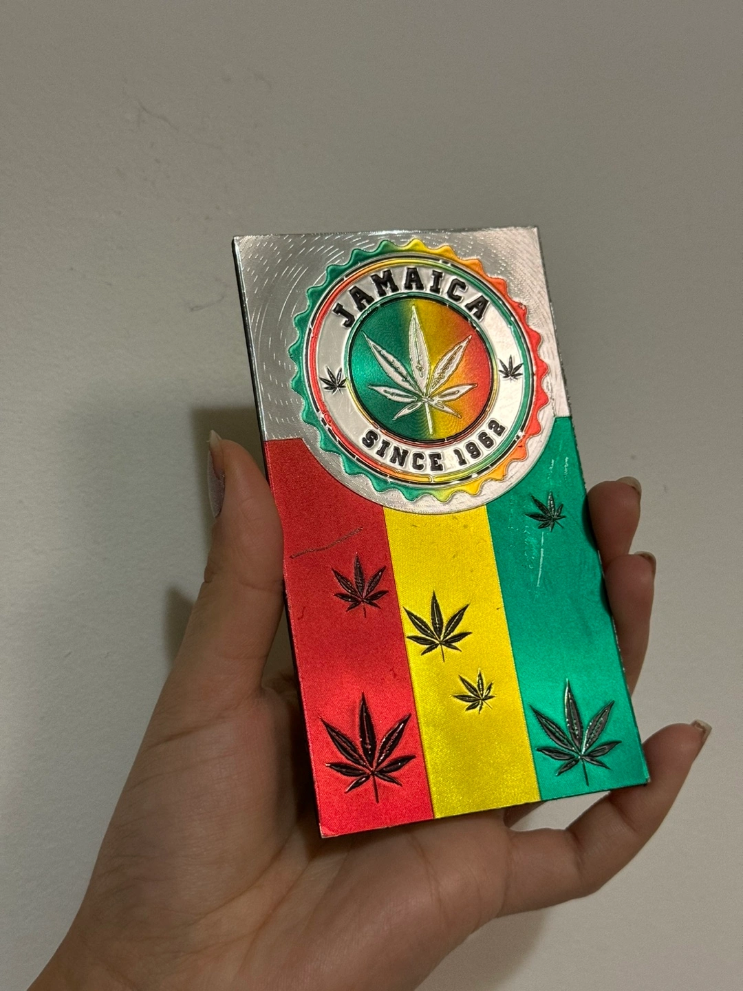 1000+Fridge magnet with a Jamaican flag design and marijuana leaf iconography. Metal.