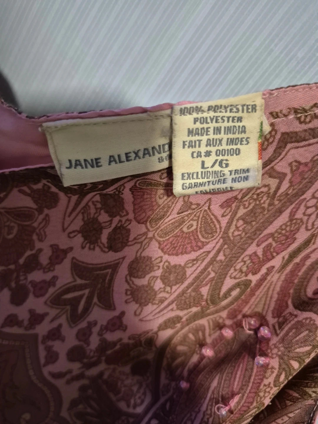 15This Jane Alexander dress features a beautiful pink paisley pattern! It's made of 100% polyester and is a size L/G. Perfect for a summer day or a night out.