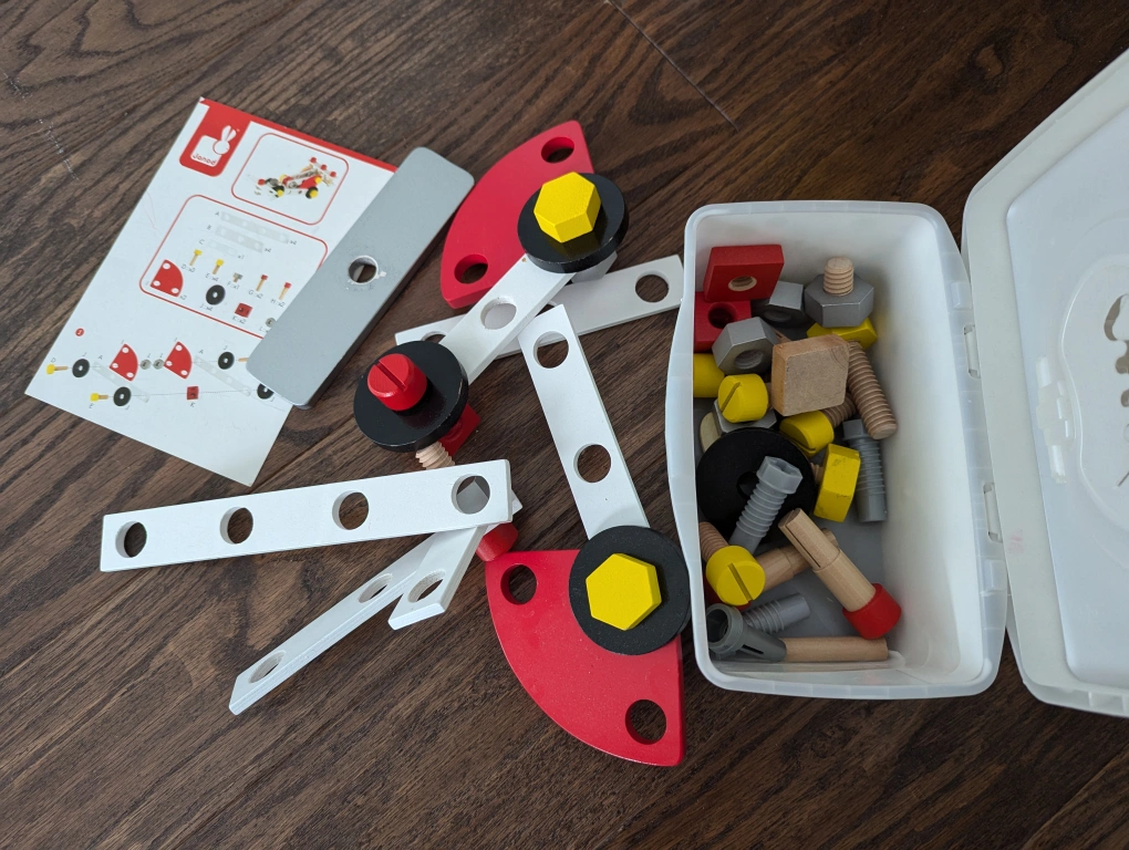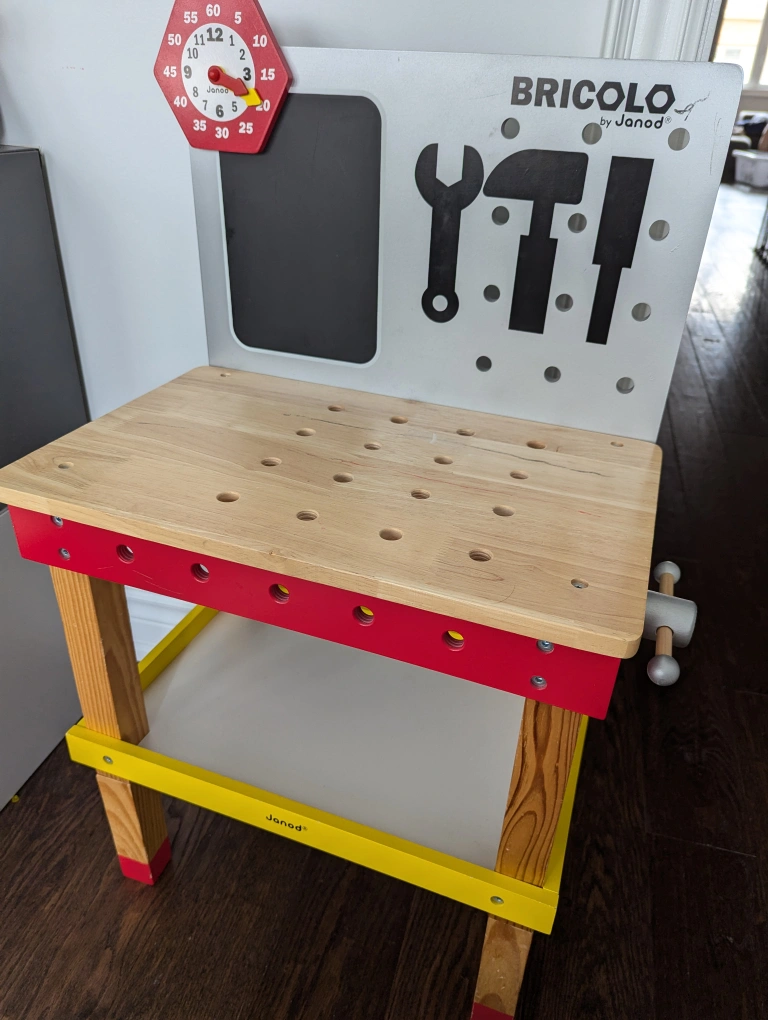 A wooden workbench with tools, nuts, bolts, and screws to help children develop their fine motor skills. Includes a small toolbox with pieces to build various structures.