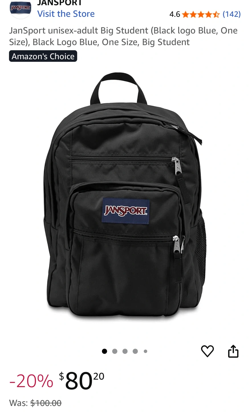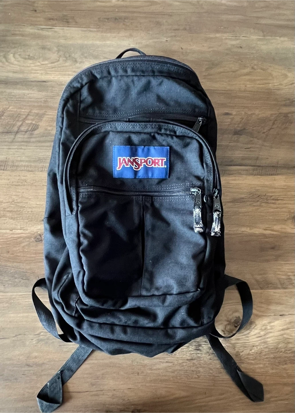 Selling a JanSport Big Student backpack in black! It's a great backpack for school, work, or travel. This backpack has multiple compartments to keep your belongings organized. The original price was $100.00.outside is spotless. Inside some compartments are showing its age.