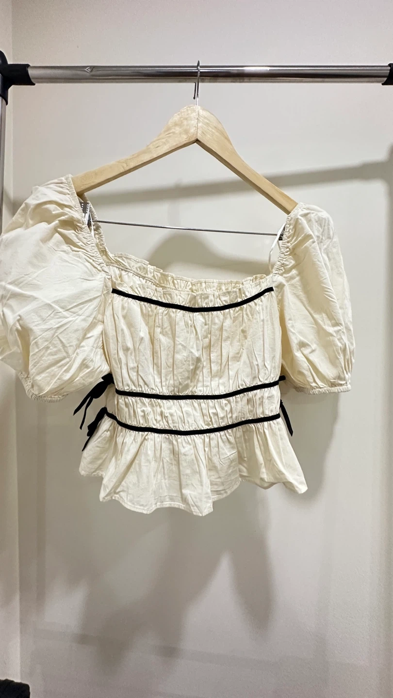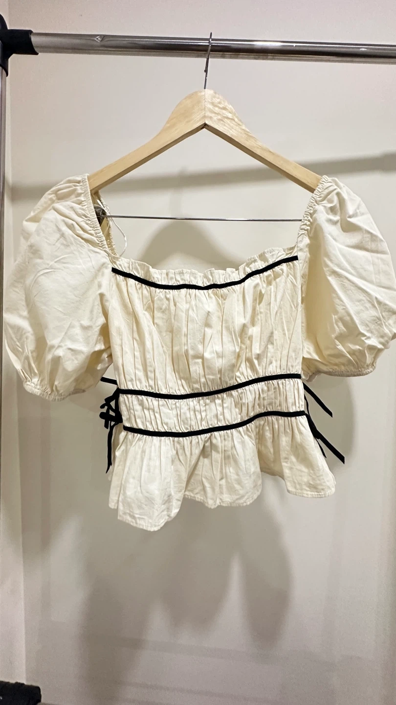 10This Japana crop top features a square neckline and puff sleeves, perfect for a stylish look! It's a size M/M and made of 100% cotton shell.
