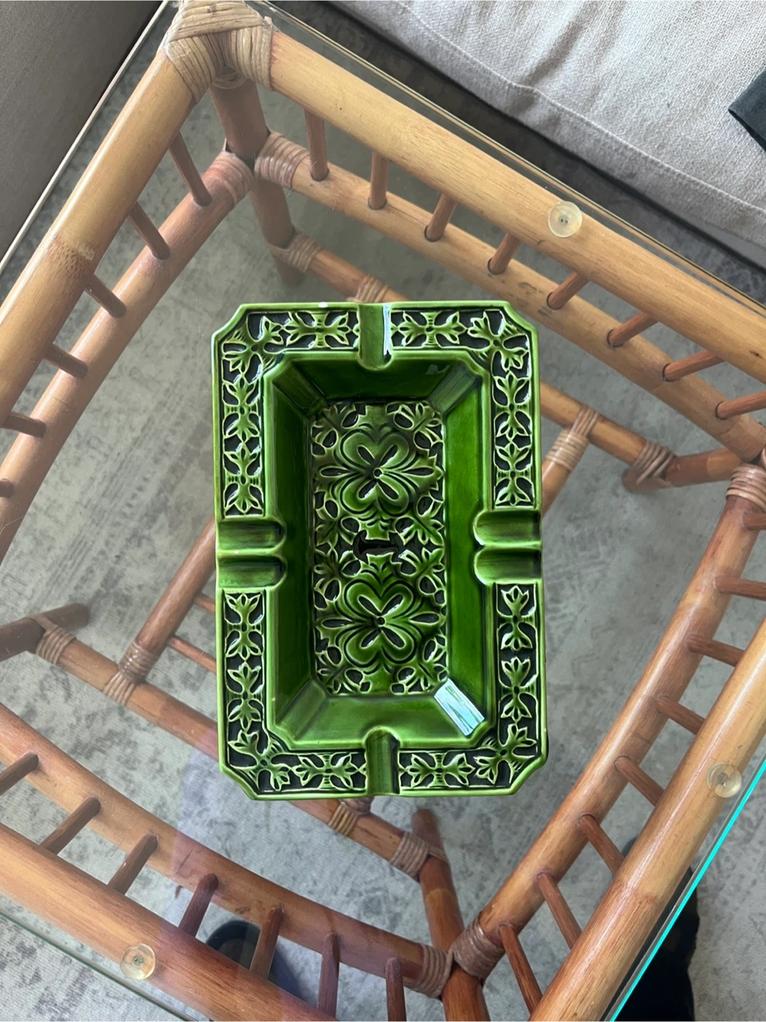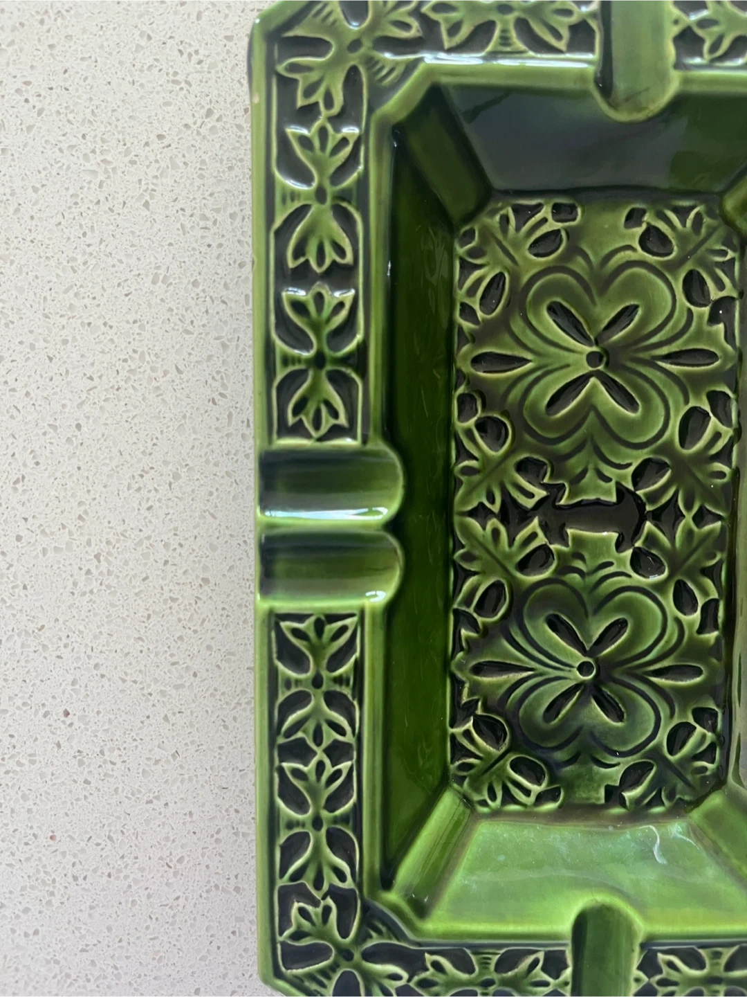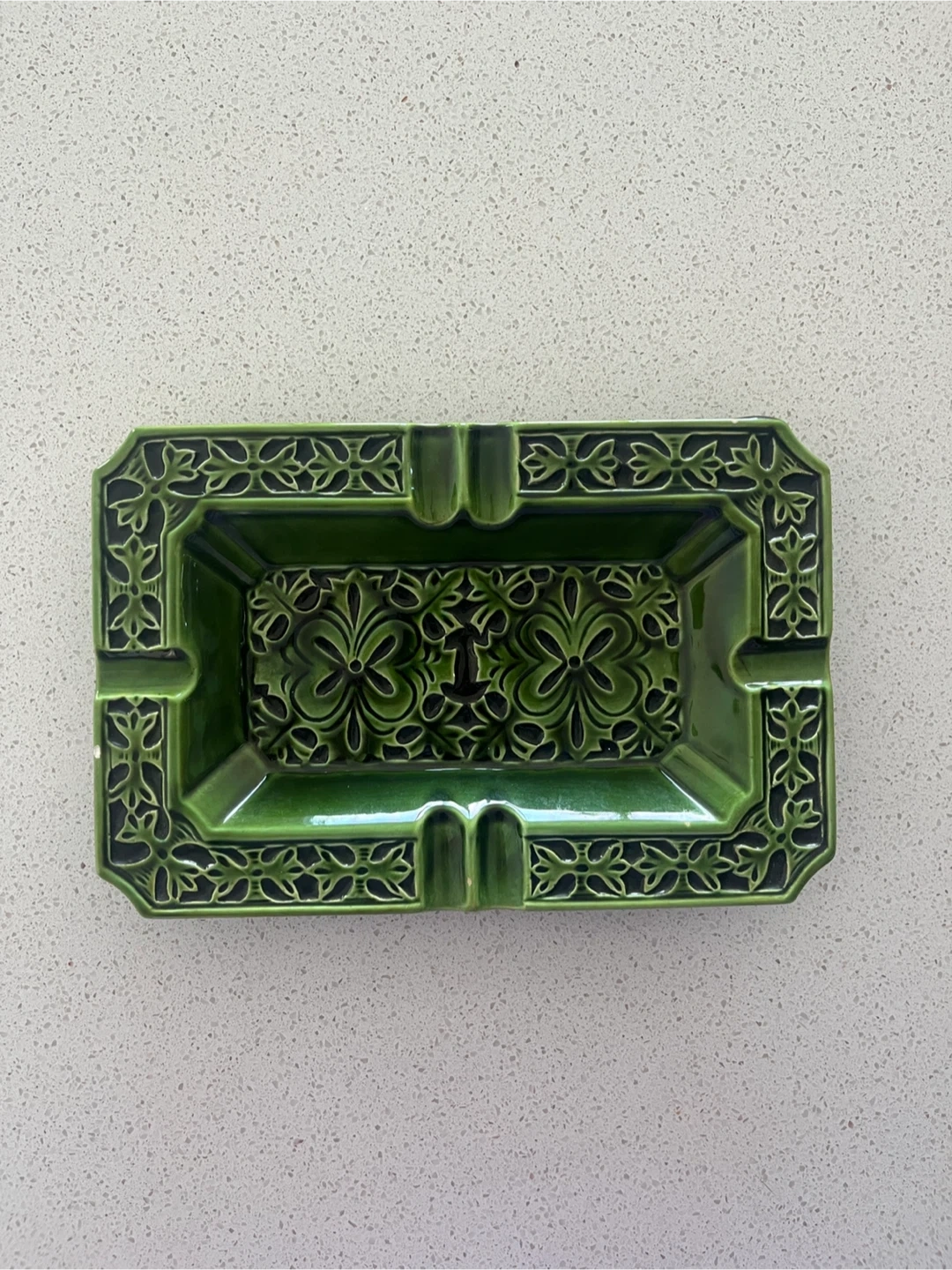 Ready to part with this exquisite Japanese Ceramic Ashtray in hues of Emerald Green. I’ve had this one in my Ashtray collection for years. The floral motifs are exceptionally unique and are very chrome heart-ish in a way. This piece would make a great addition to any collection or as a decorative item, but I guess can be used for utilitarian purposes too.