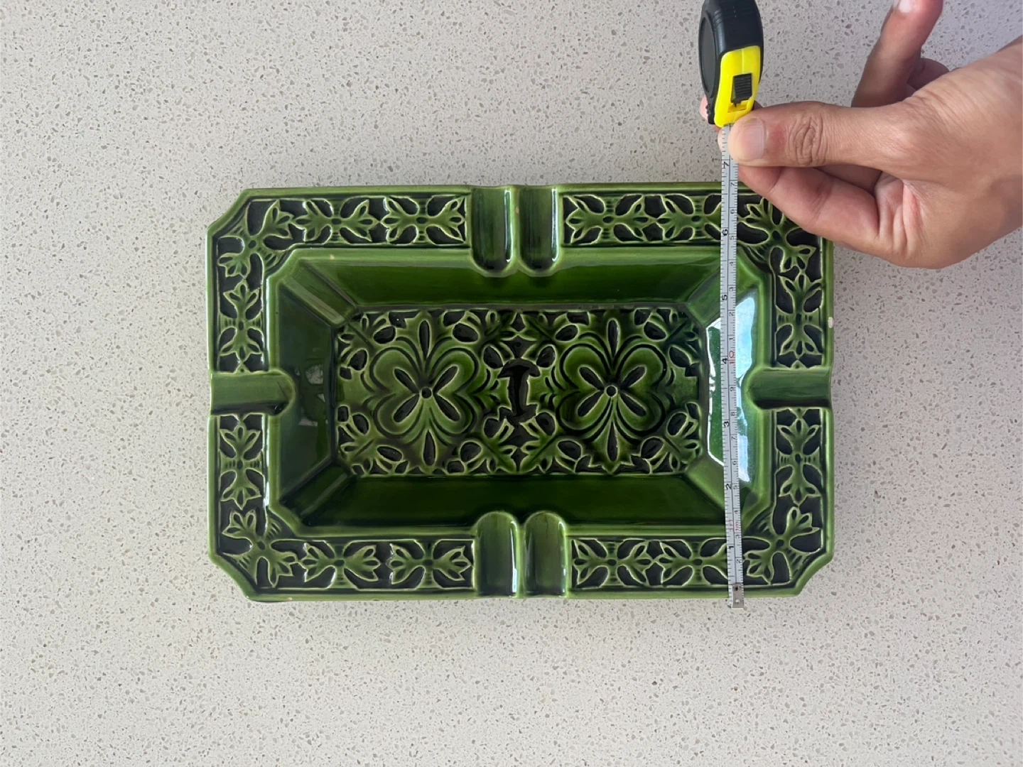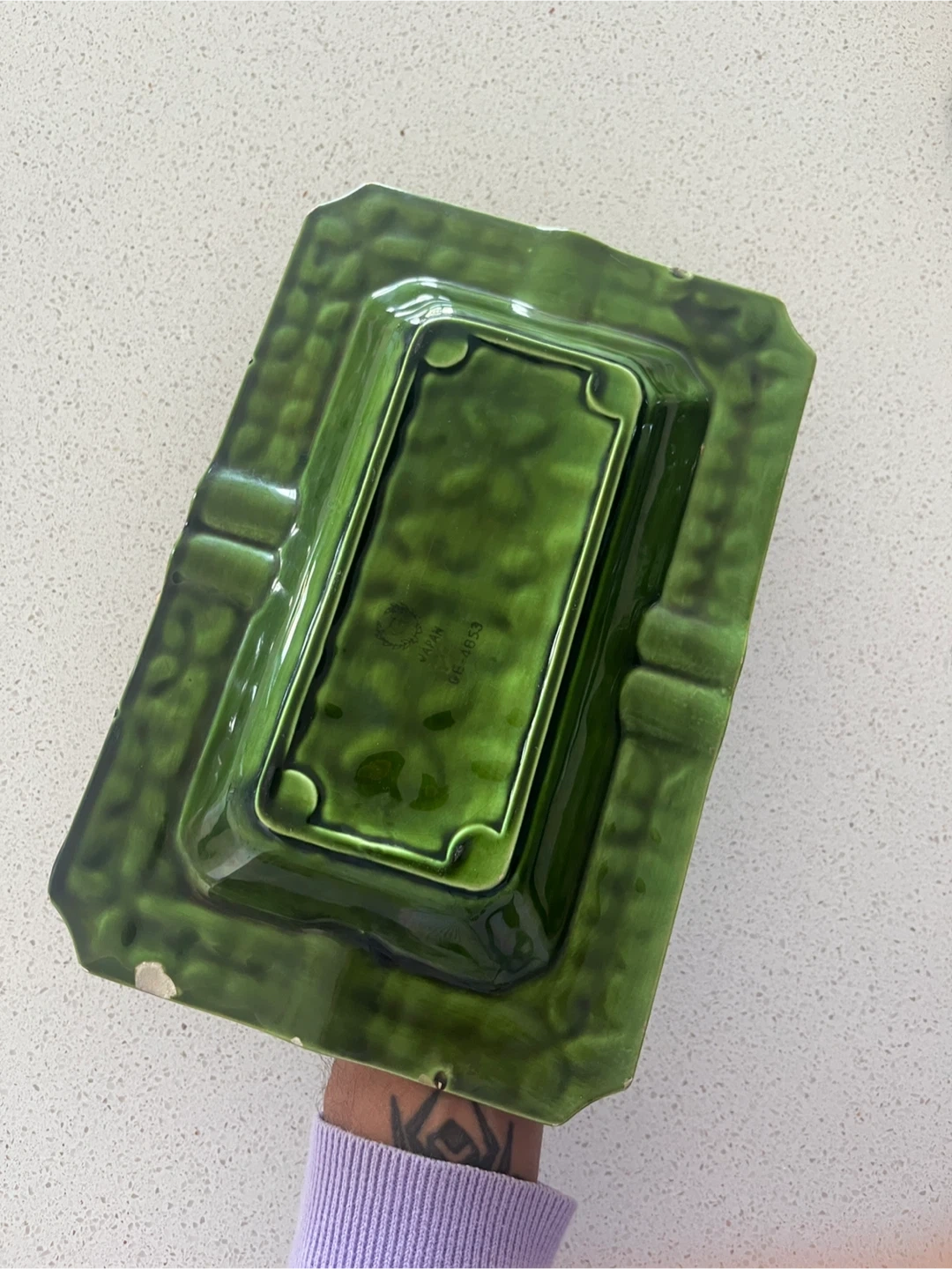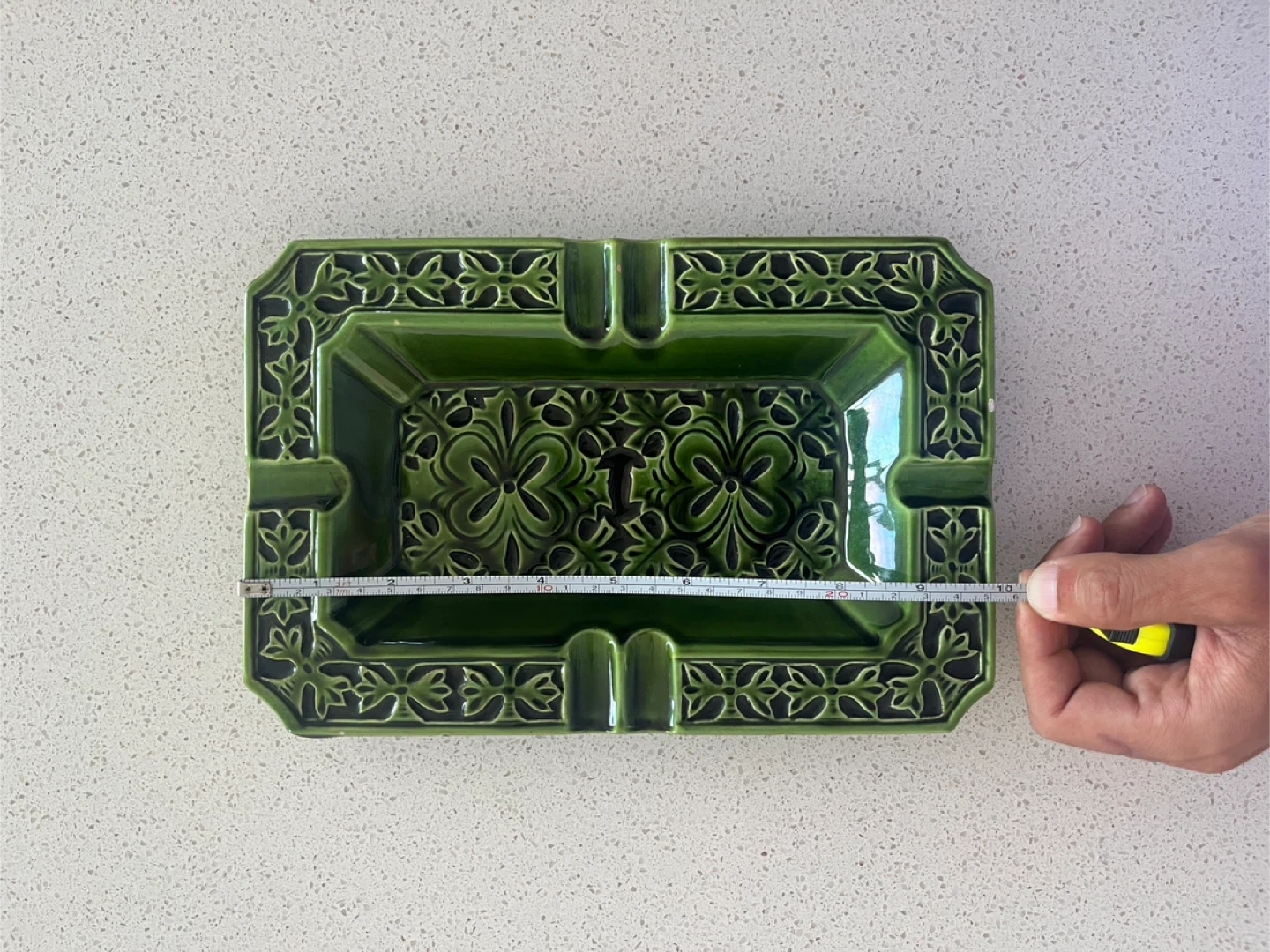 Ready to part with this exquisite Japanese Ceramic Ashtray in hues of Emerald Green. I’ve had this one in my Ashtray collection for years. The floral motifs are exceptionally unique and are very chrome heart-ish in a way. This piece would make a great addition to any collection or as a decorative item, but I guess can be used for utilitarian purposes too.
