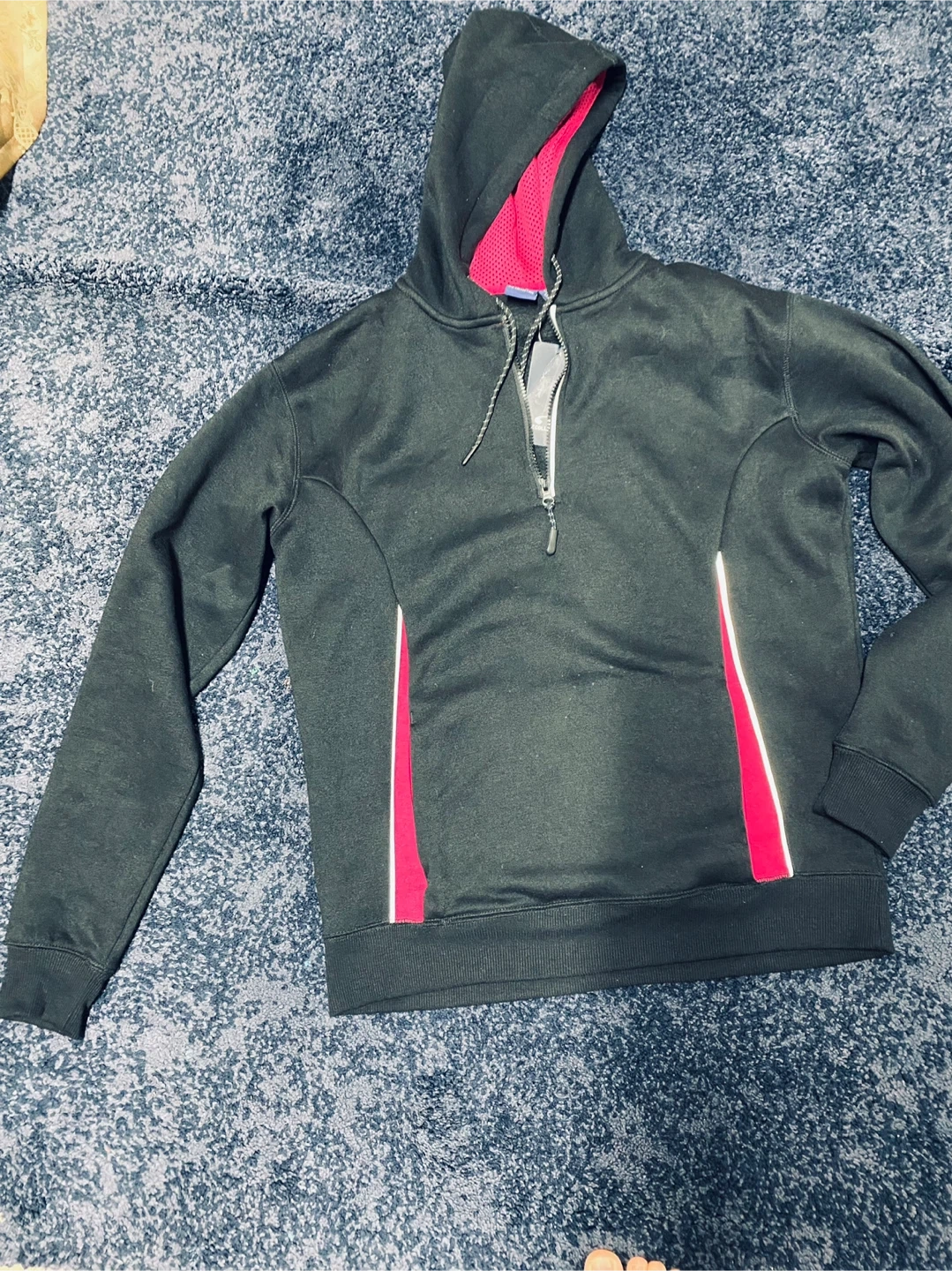 New BIZ COLLECTION hoodie. Black color with cool pink mesh lining in the hood. Has a half-zip front and pink and white stripes on the sides. Size Small - Medium for ladies. Super comfy.