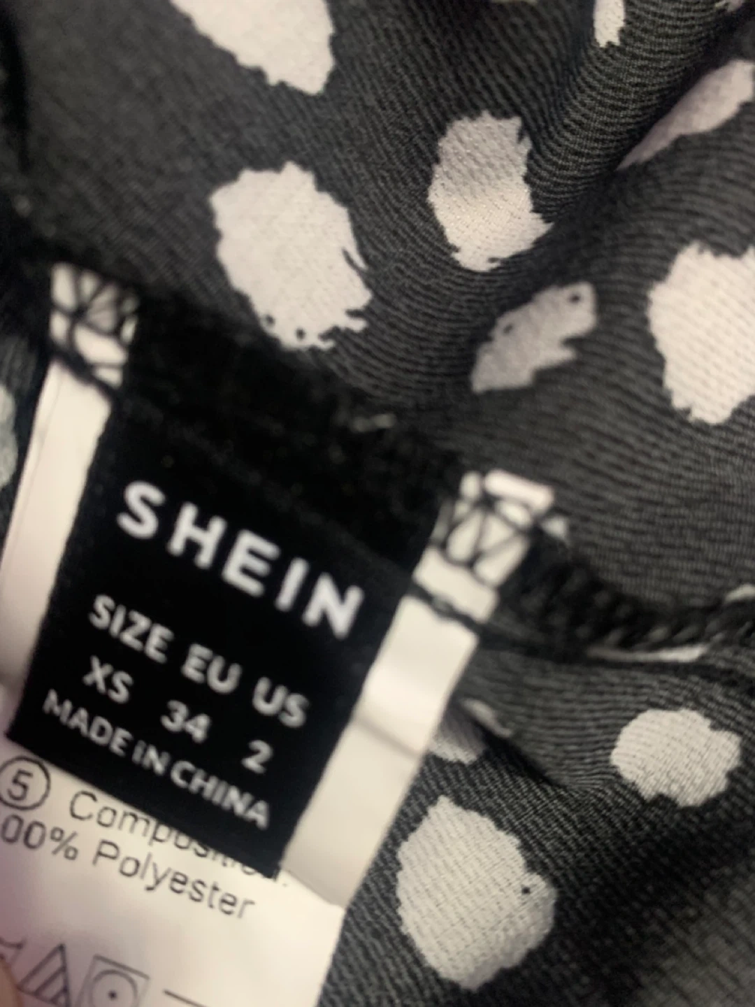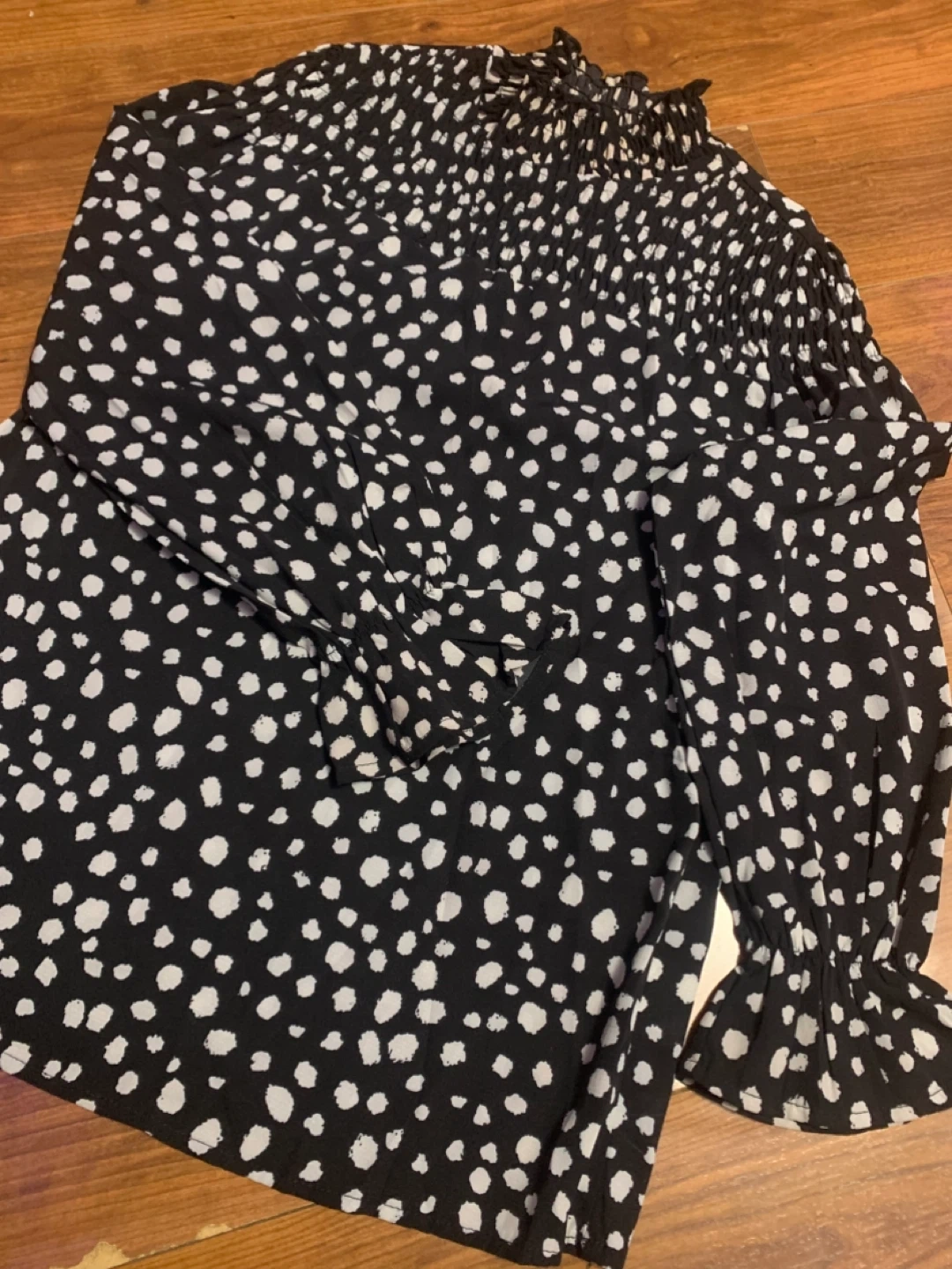 This SHEIN top features a black and white polka dot pattern with a ruffled neckline and cuffs.