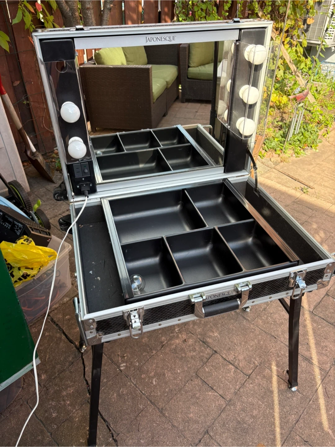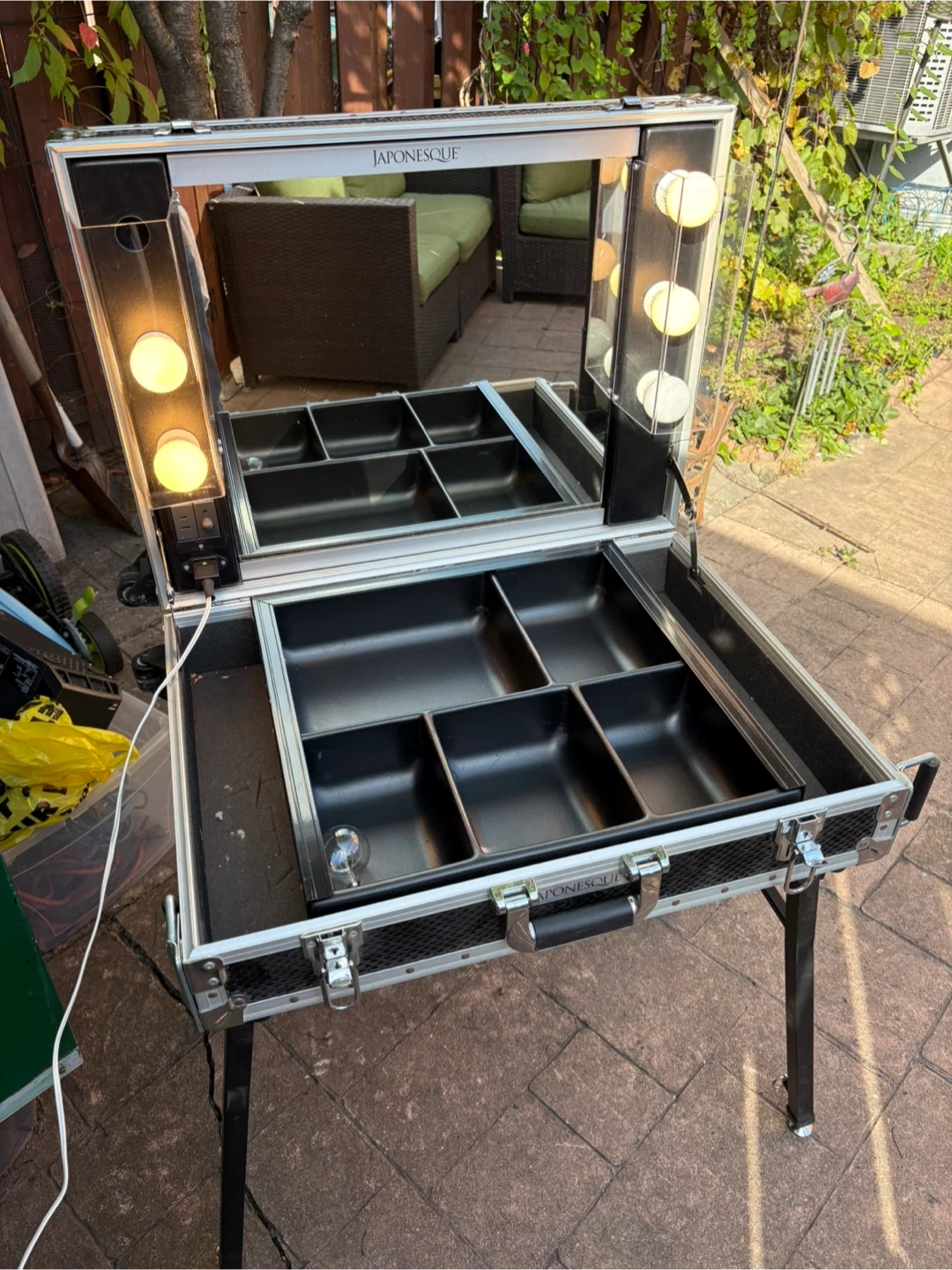 Japonesque makeup artist train case! It comes with lights(only 4 bulbs work) and a mirror, perfect for setting up your makeup station anywhere. The case is in great shape and ready for a new home