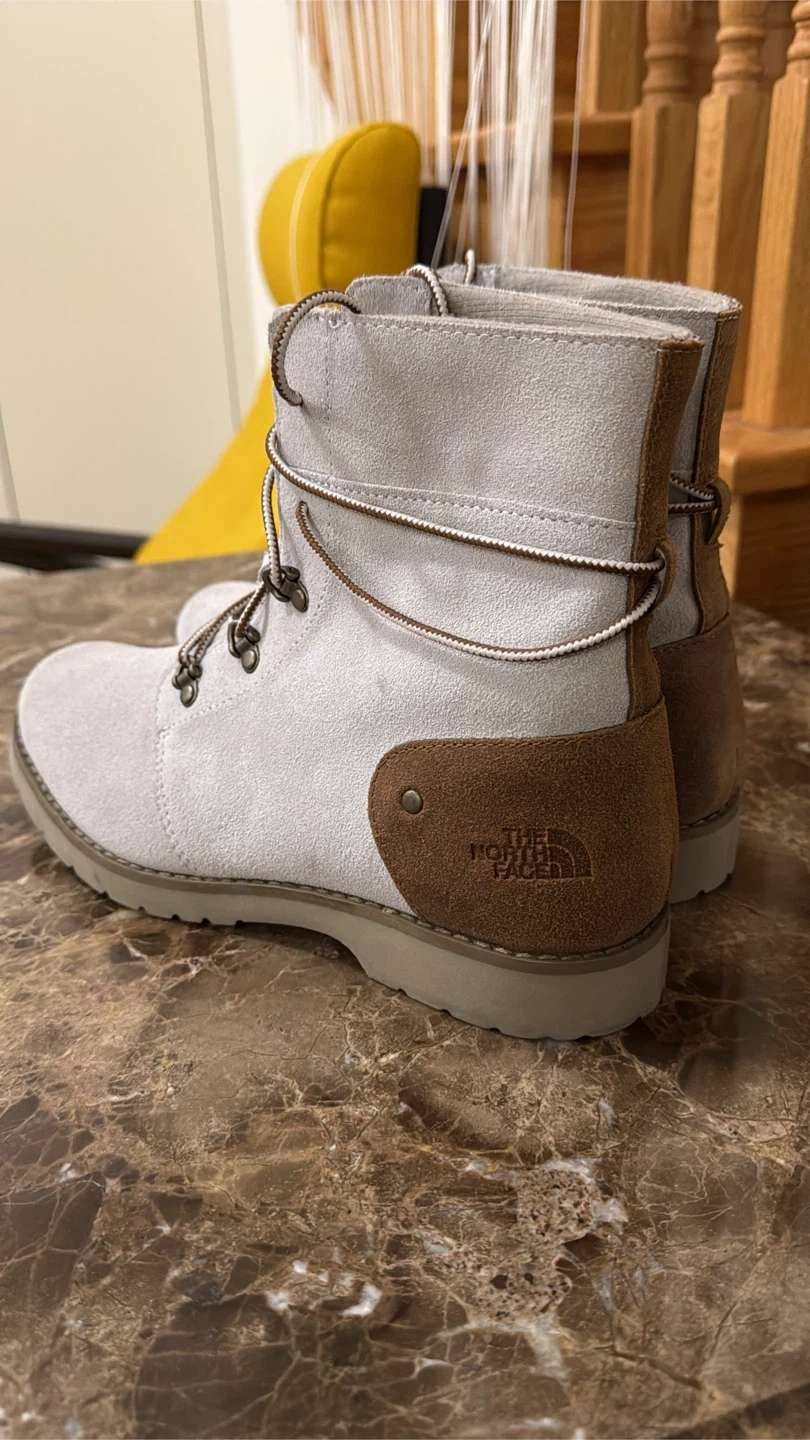 Light grey suede winter boots from The North Face. Lace-up style with brown accent details. Perfect for keeping your feet warm and dry during colder months!