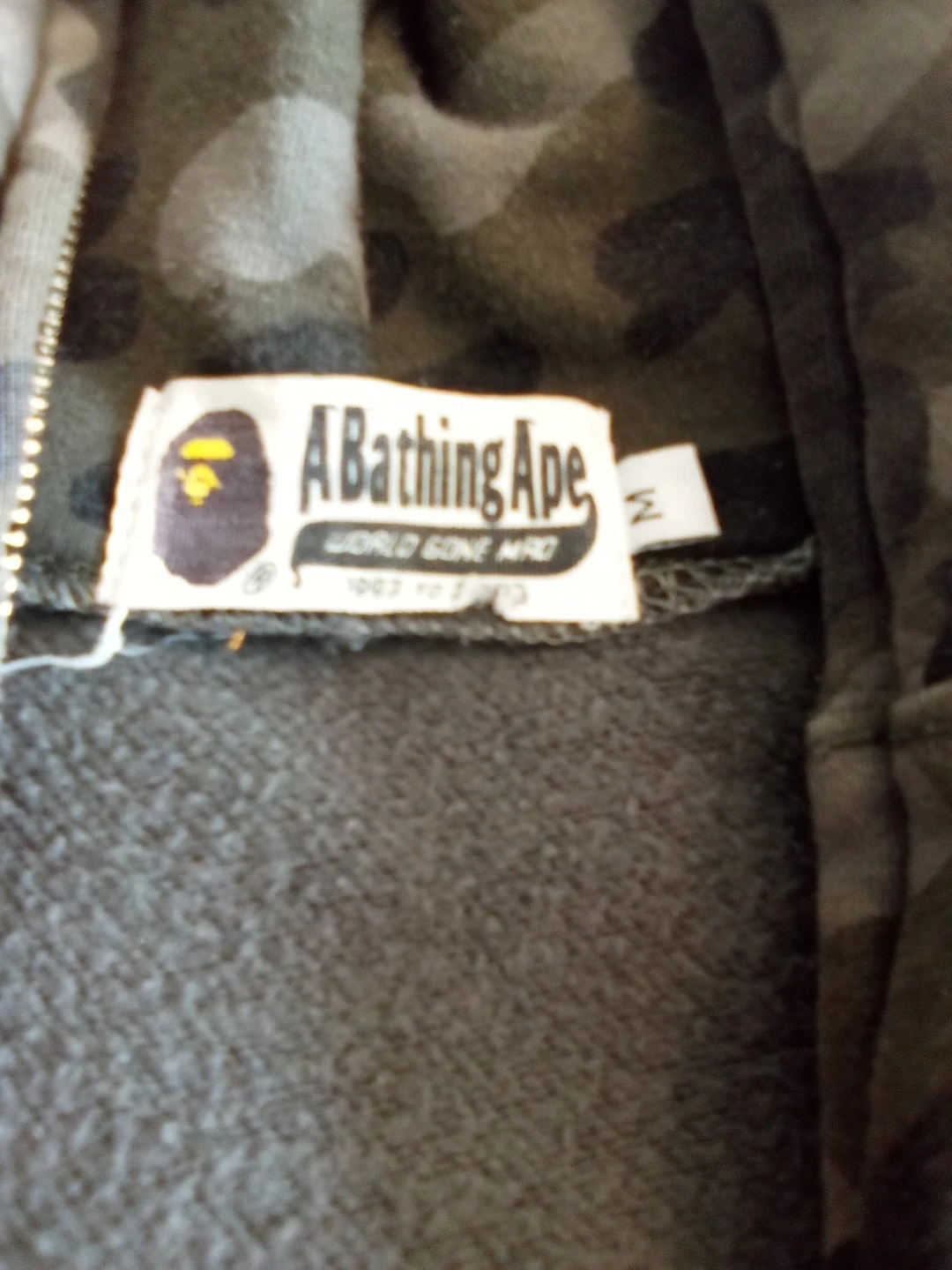 A Bathing Ape full-zip hoodie featuring the iconic shark graphic and camouflage pattern. Size medium. Great for streetwear enthusiasts!