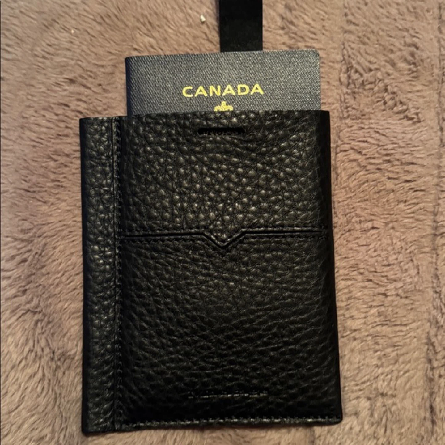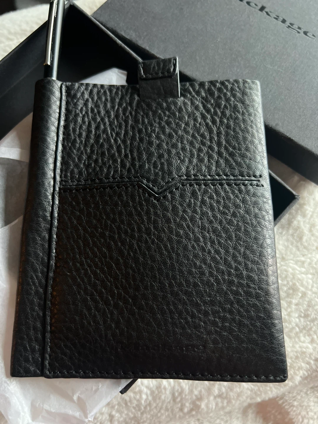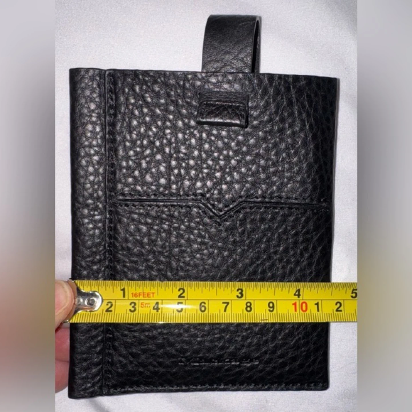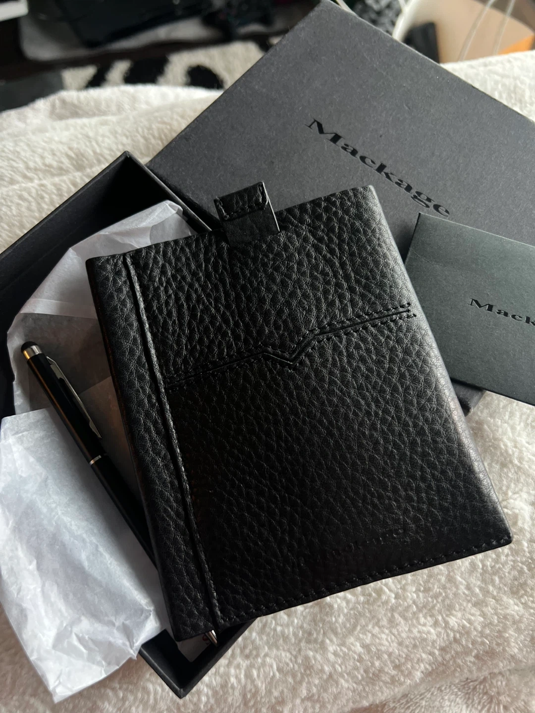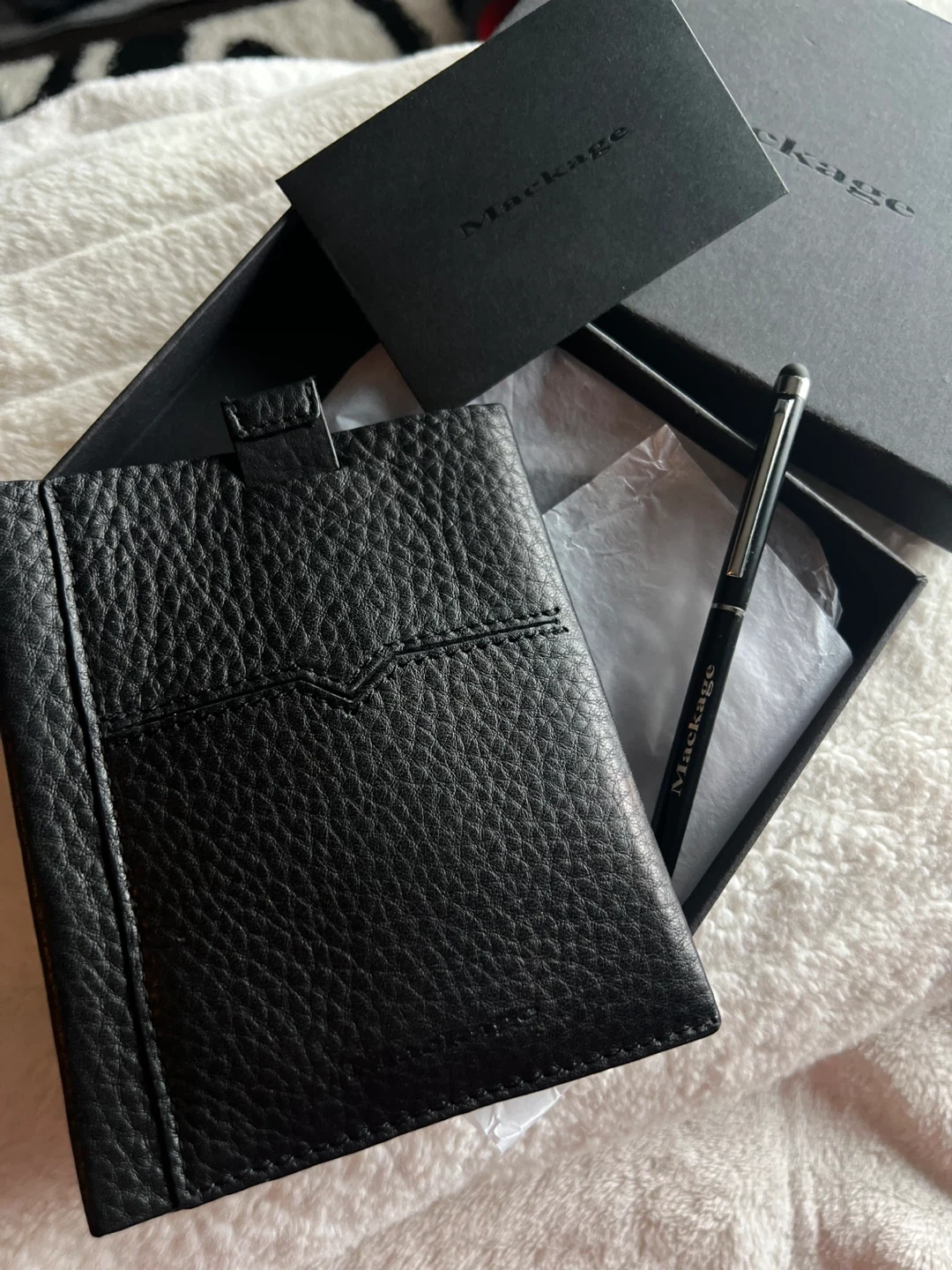 This is a stylish black leather card holder from Mackage. It's made with pebbled leather and comes with a matching pen. The holder measures approximately 6 inches tall and 4 inches wide. It's perfect for travel or everyday organization!