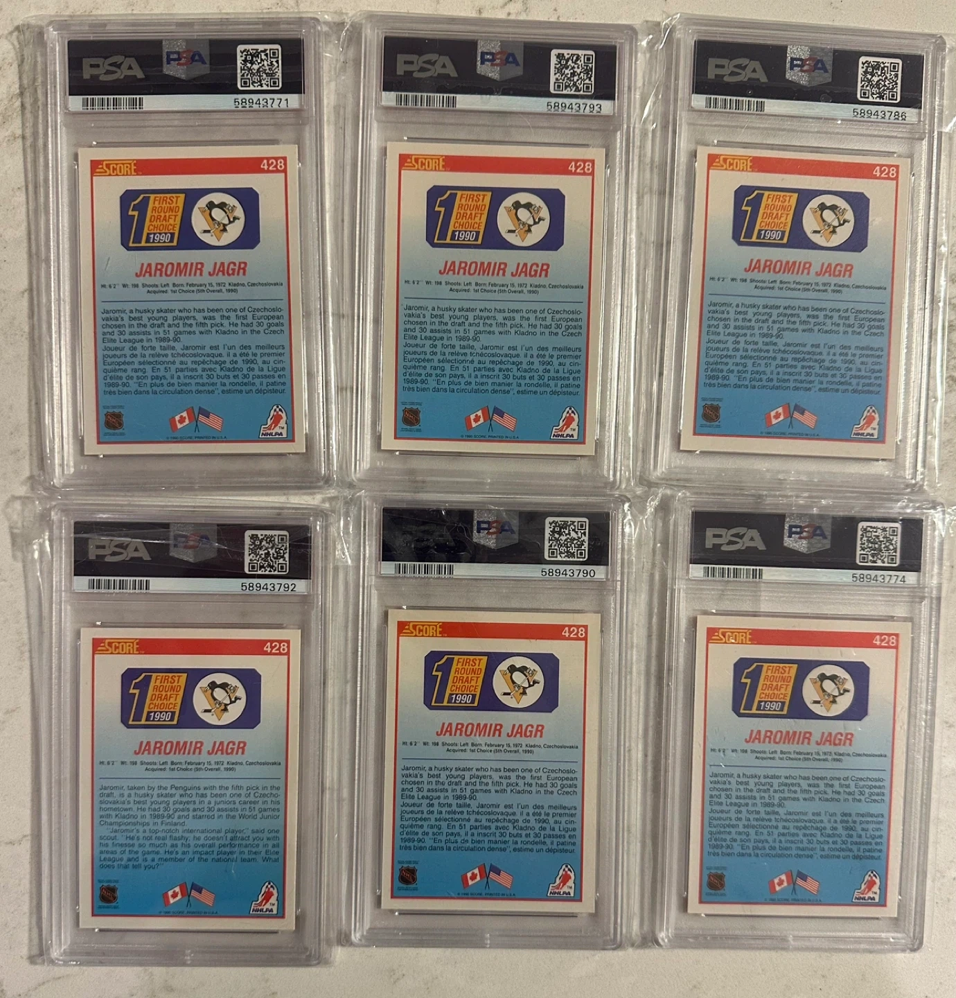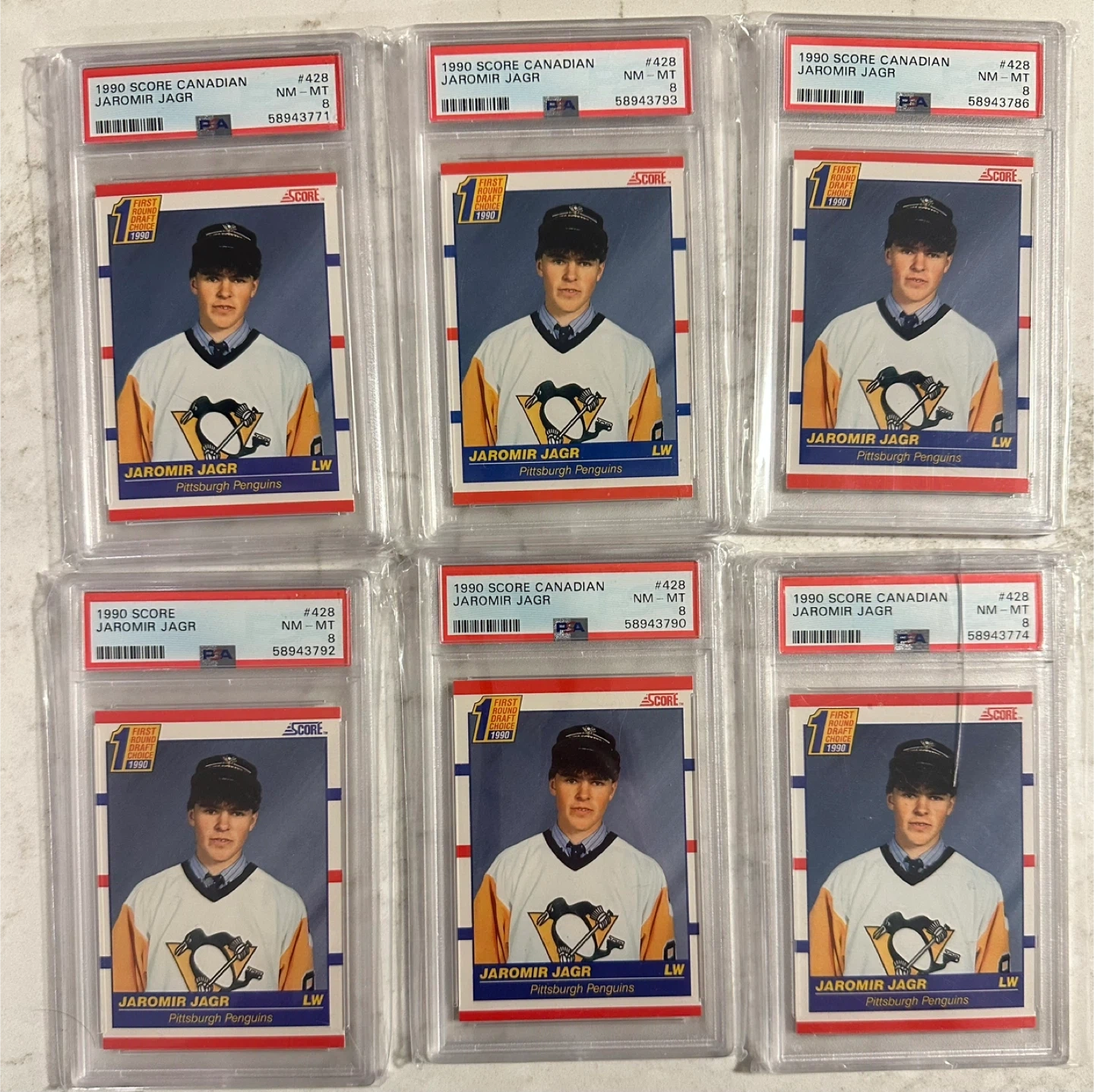 15Selling Individually six 1990 Score Jaromir Jagr Rookie Cards graded PSA 8’s. Five are Canadian Print cards. One has a crack on the front as noted in photos. Price is $25 each.