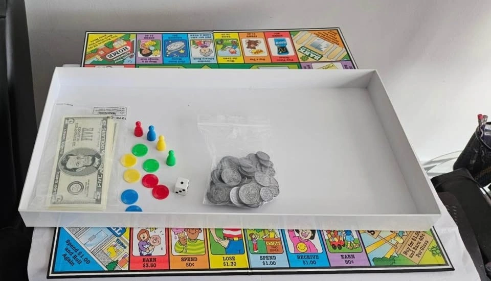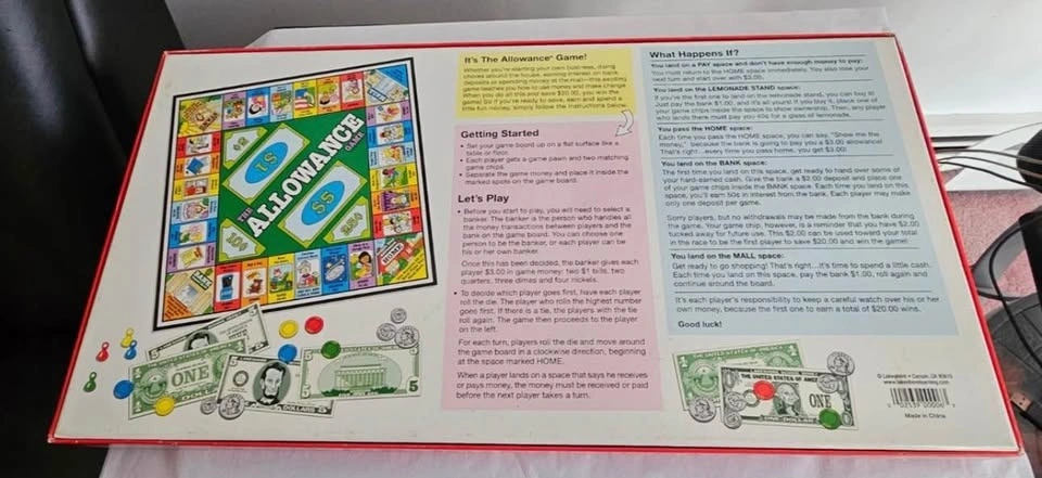 "The Allowance Game" by Lakeshore is a board game designed for children ages 5 and up. Suitable for both boys and girls. This finance-themed game can be played by 2 to 4 players and allows kids to develop their money management skills in a fun and interactive way. With a focus on practical concepts like saving, spending, and earning, this game is perfect for teaching young children about finances in a playful and engaging manner. This complete game set includes all the necessary components for an exciting gameplay. Directions are on the bottom of the box. See photos of game.