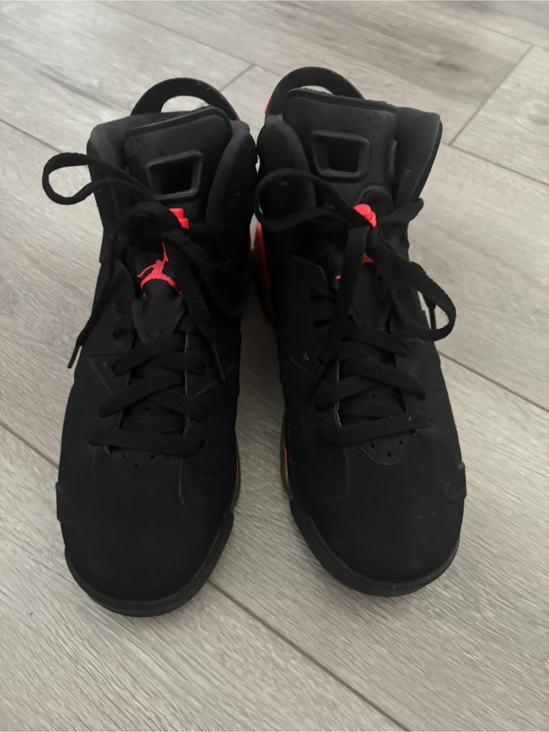 Black suede and leather Air Jordan 6 Retro sneakers with bright infrared accents. Features a rubber sole with Jumpman logo detailing. These are a great pair for everyday wear!