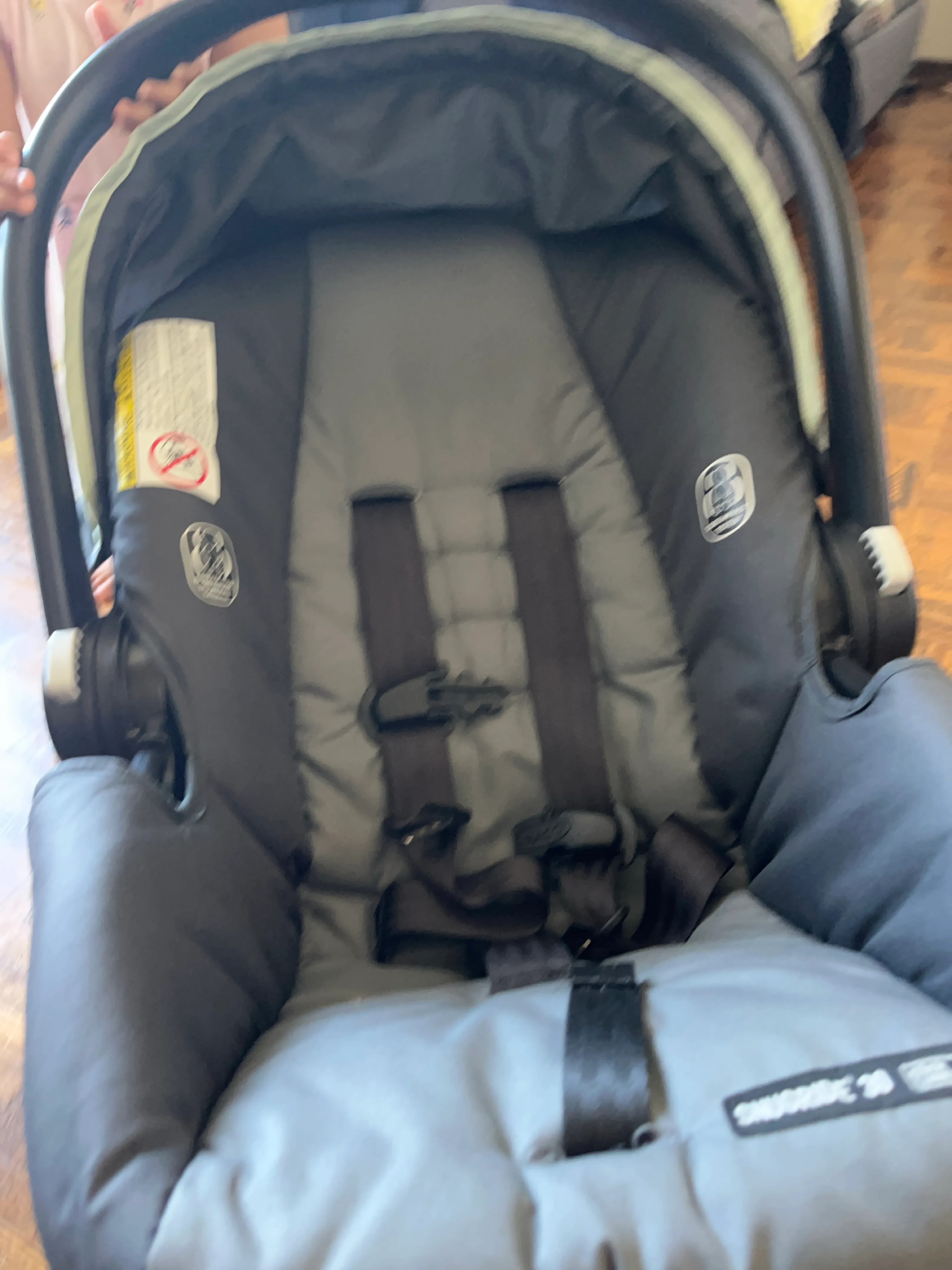 This is a Graco SnugRide 30 infant car seat. It's a grey and black car seat with a 5-point harness. This car seat is great for keeping infants safe on the go!