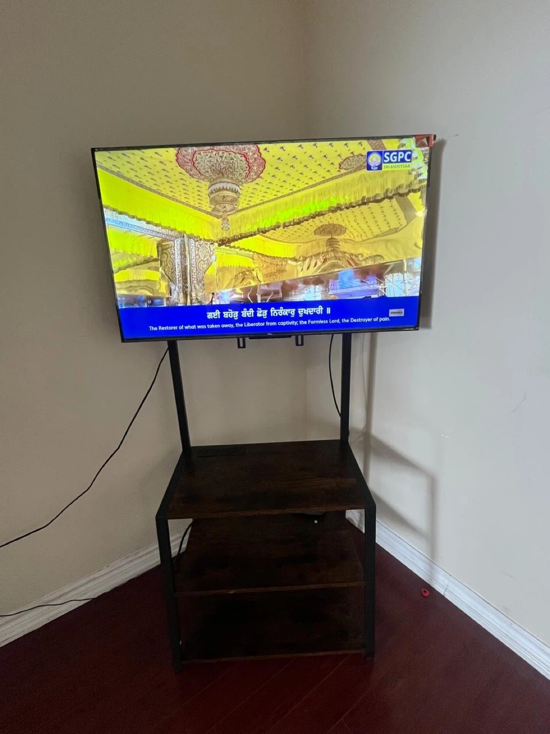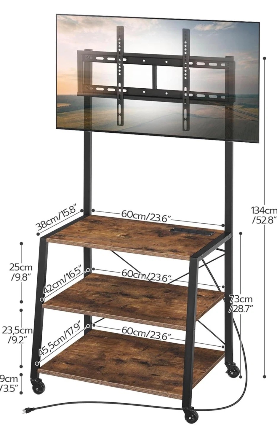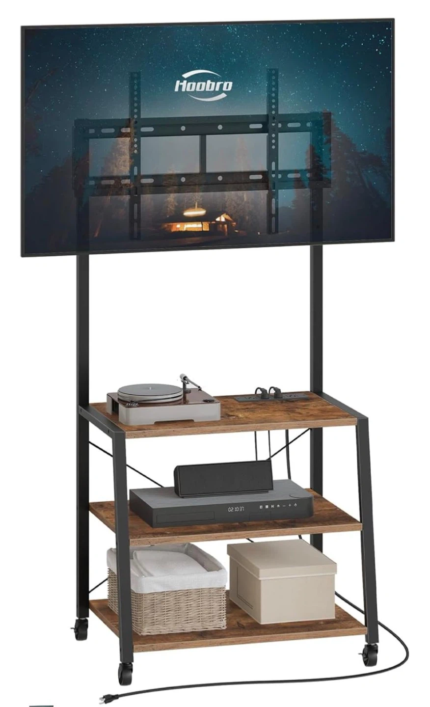 This Hoobro adjustable TV mount stand is perfect for your living room. It features three shelves for storage and it's adjustable for TVs of all sizes. The stand has a rustic wood finish and a black metal frame. It's on wheels for easy mobility!