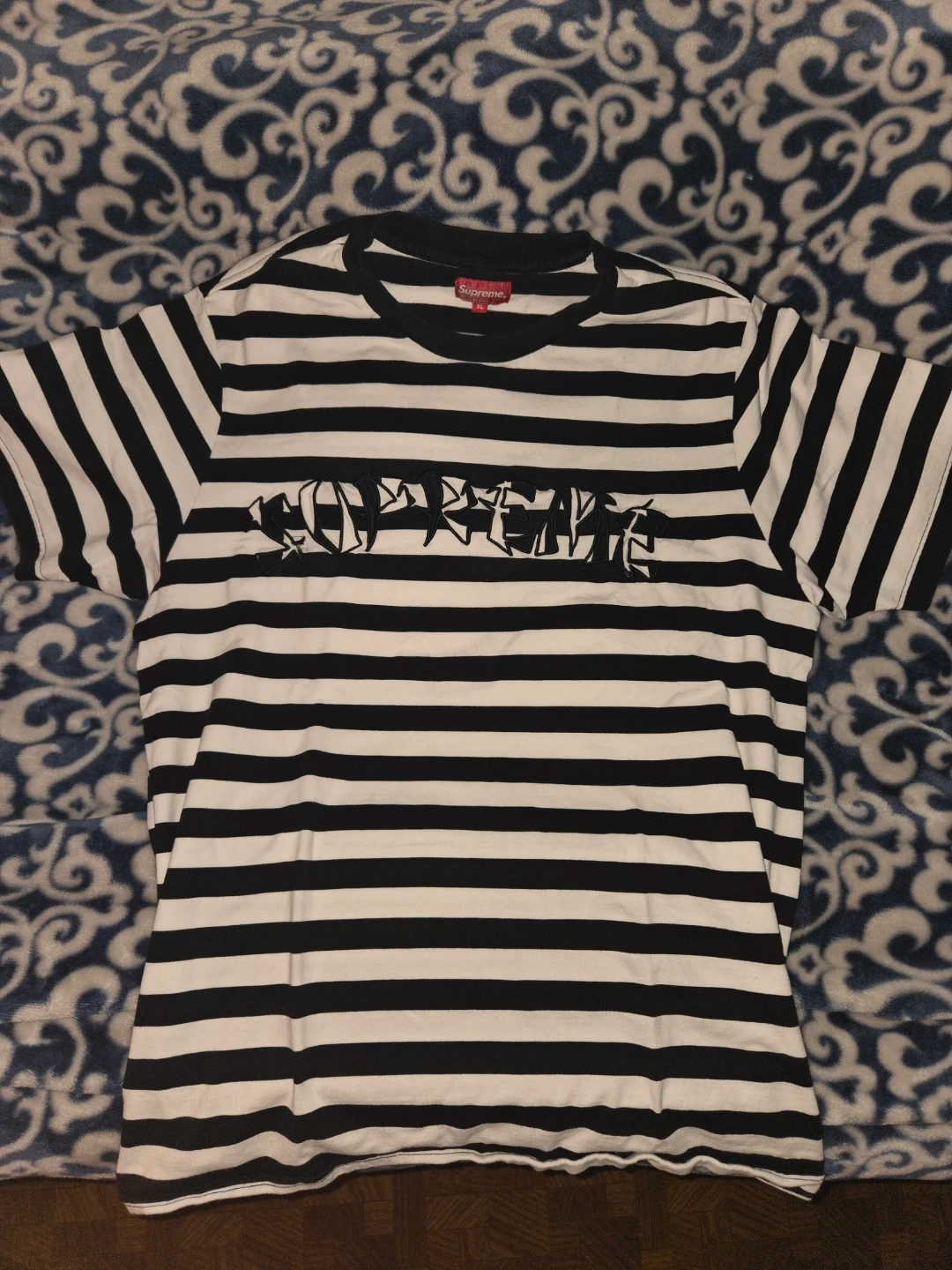 Supreme striped t-shirt in black and white. Features the Supreme logo on the chest. Size XL. Cotton material. Fits like a large ( $80 store price)