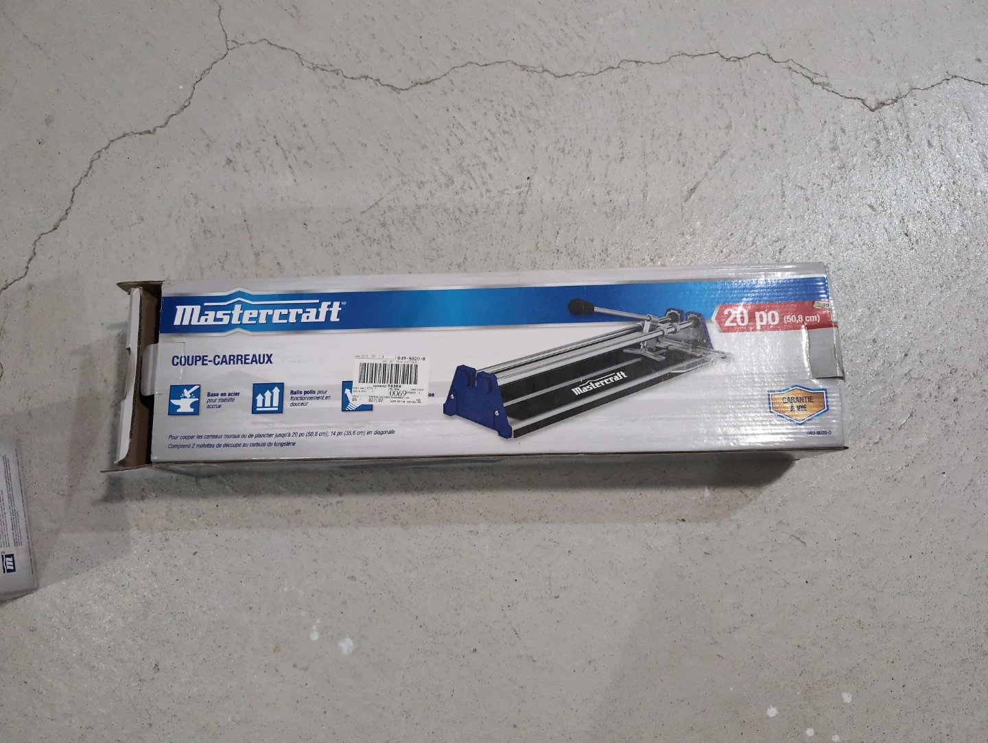 Mastercraft tile cutter for straight cuts up to 20 inches and diagonal cuts up to 14 inches. It features a steel base for stability and polished rails for smooth operation. Includes 2 tungsten carbide cutting wheels.