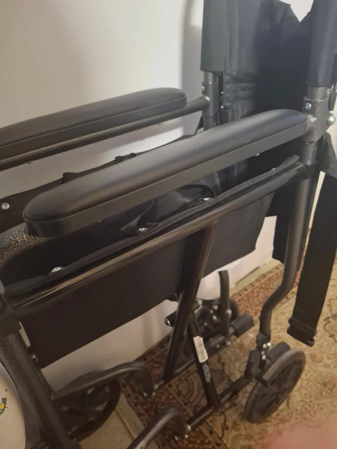A black lightweight wheelchair with padded armrests. It features a durable frame and back support. This wheelchair is designed for easy mobility and transport.