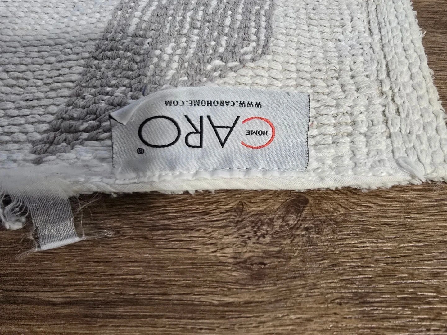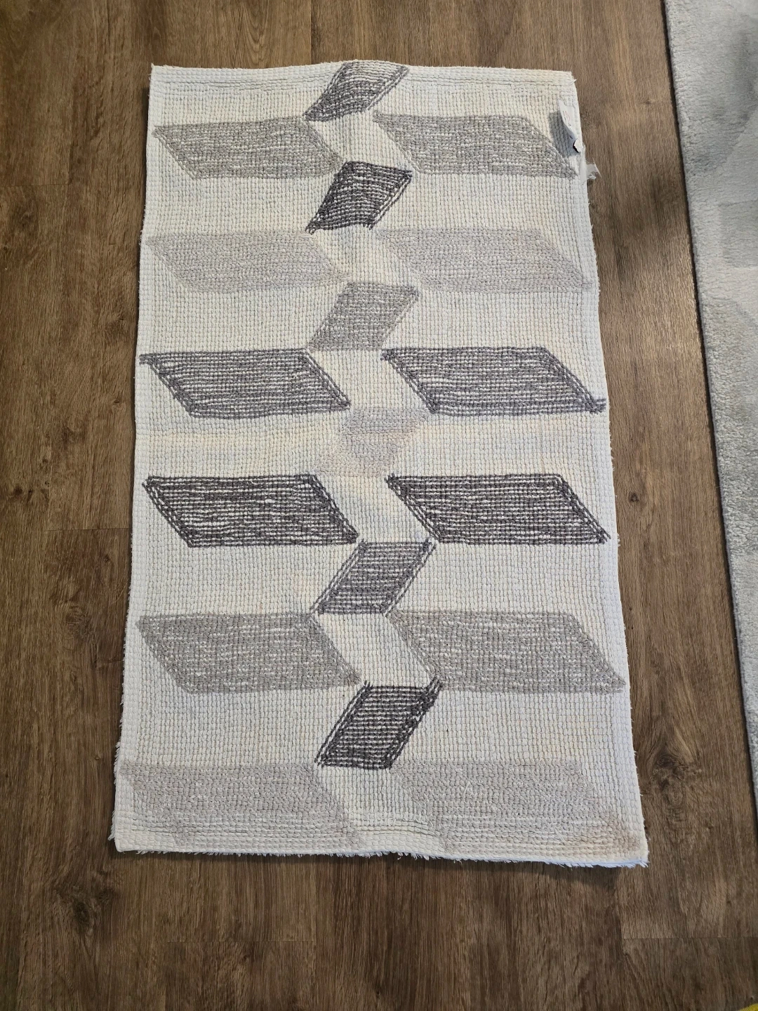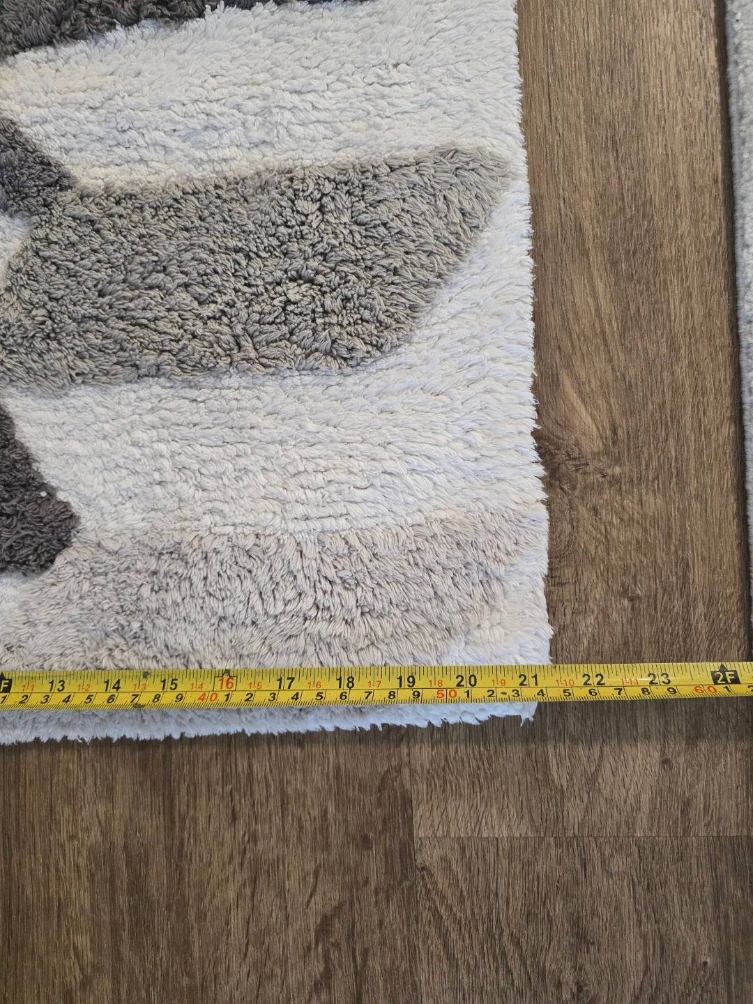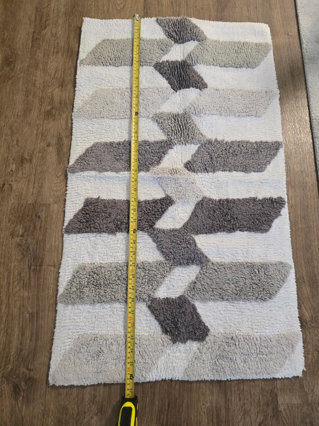 This Caro Home bath mat runner features a modern geometric pattern in white, grey, and beige. It's made from a soft, textured material. Measurements are approximately 20 inches wide by 34 inches long.