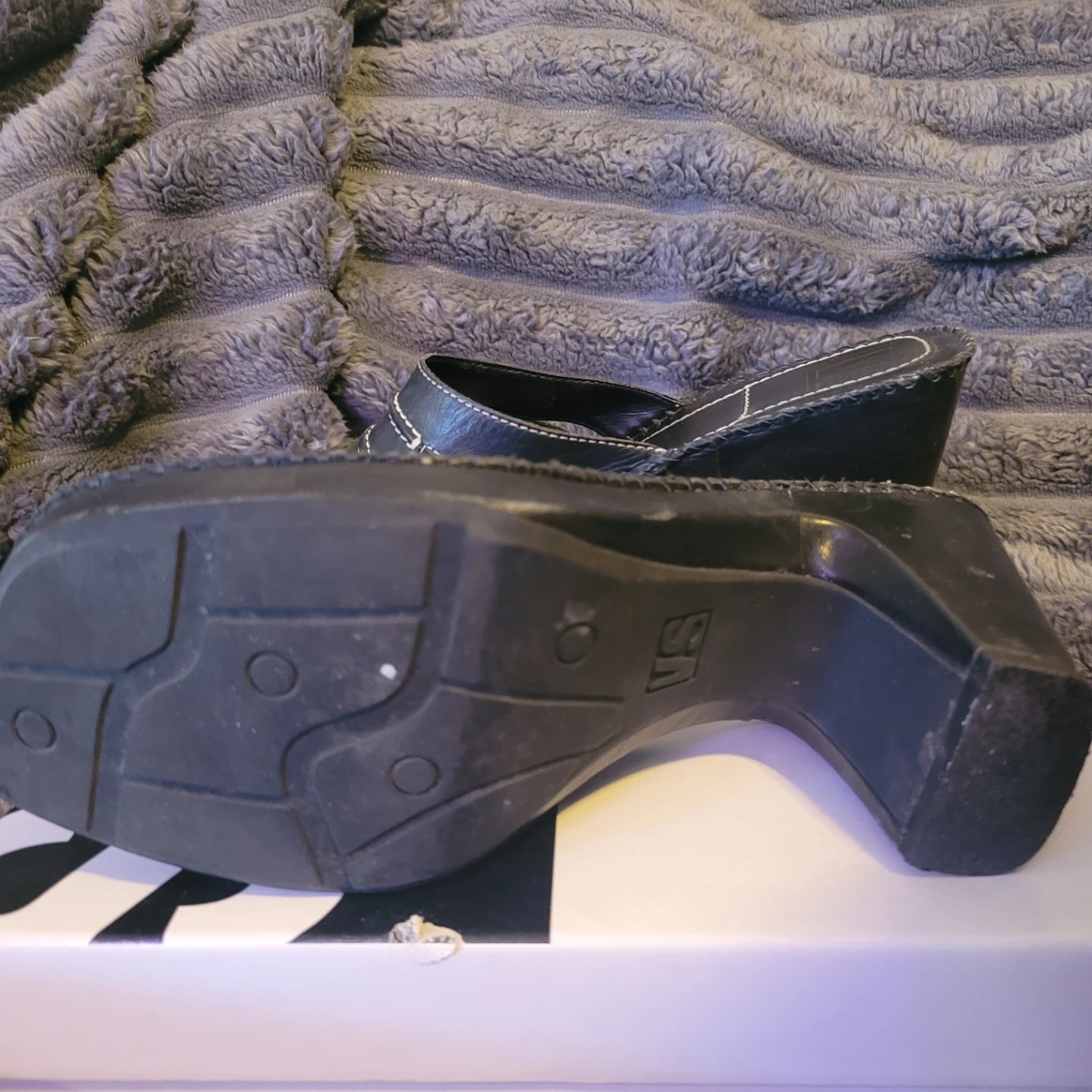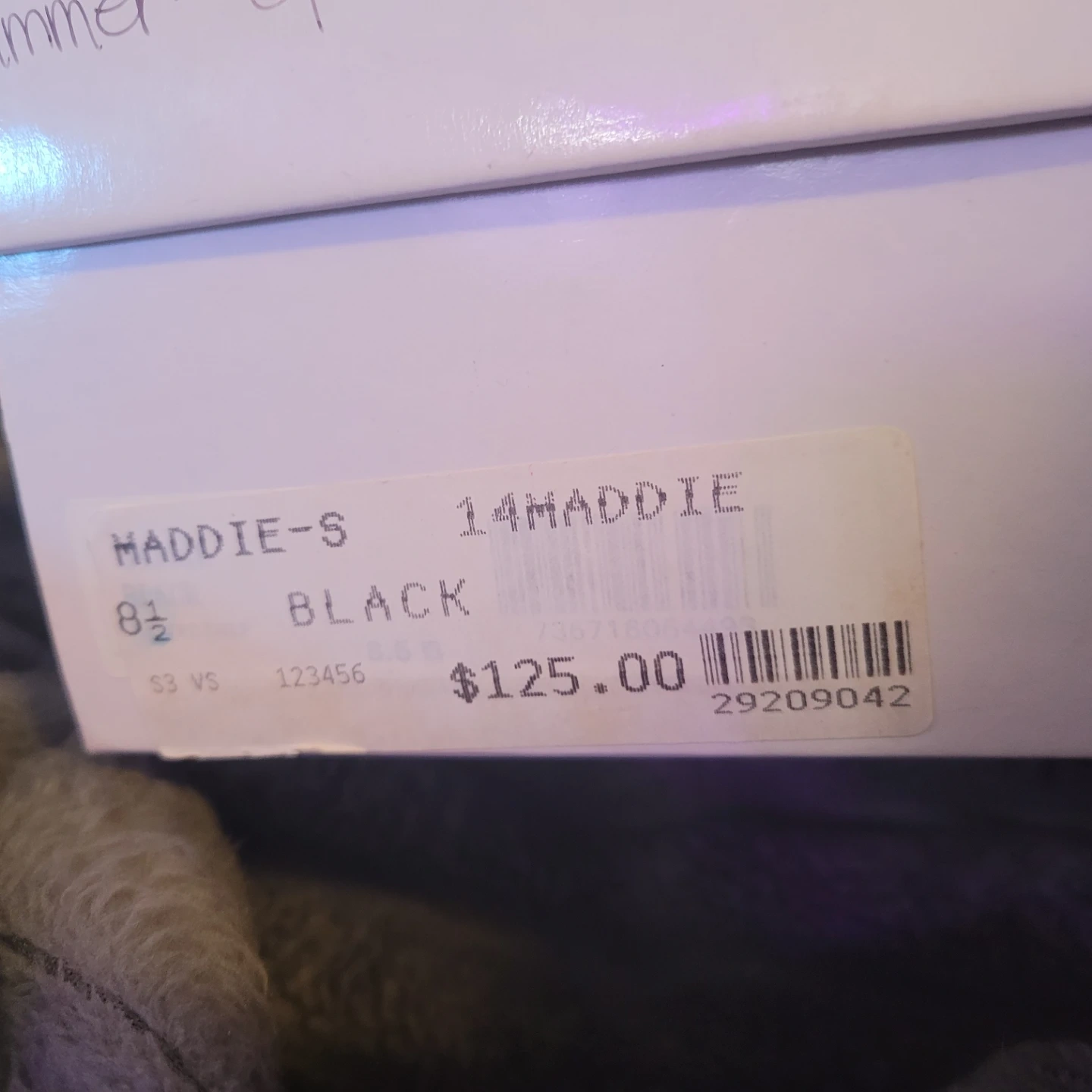 VS MADDIE-S black mules with white stitching detail. Heel height is approximately 3 inches. These are size 8.5 and made of leather. Slip-on style for easy wear!