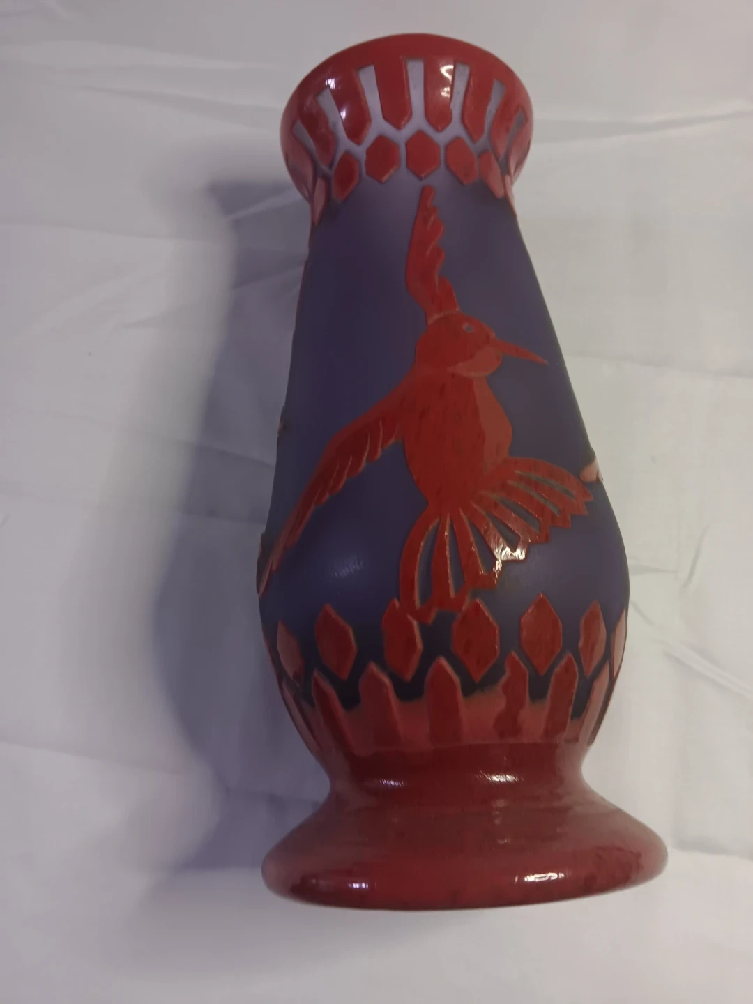 A decorative vase featuring a hummingbird design. It has a matte purple body with a frosted texture and red accents around the rim and base. The body of the vase showcases etched or painted hummingbirds in flight.