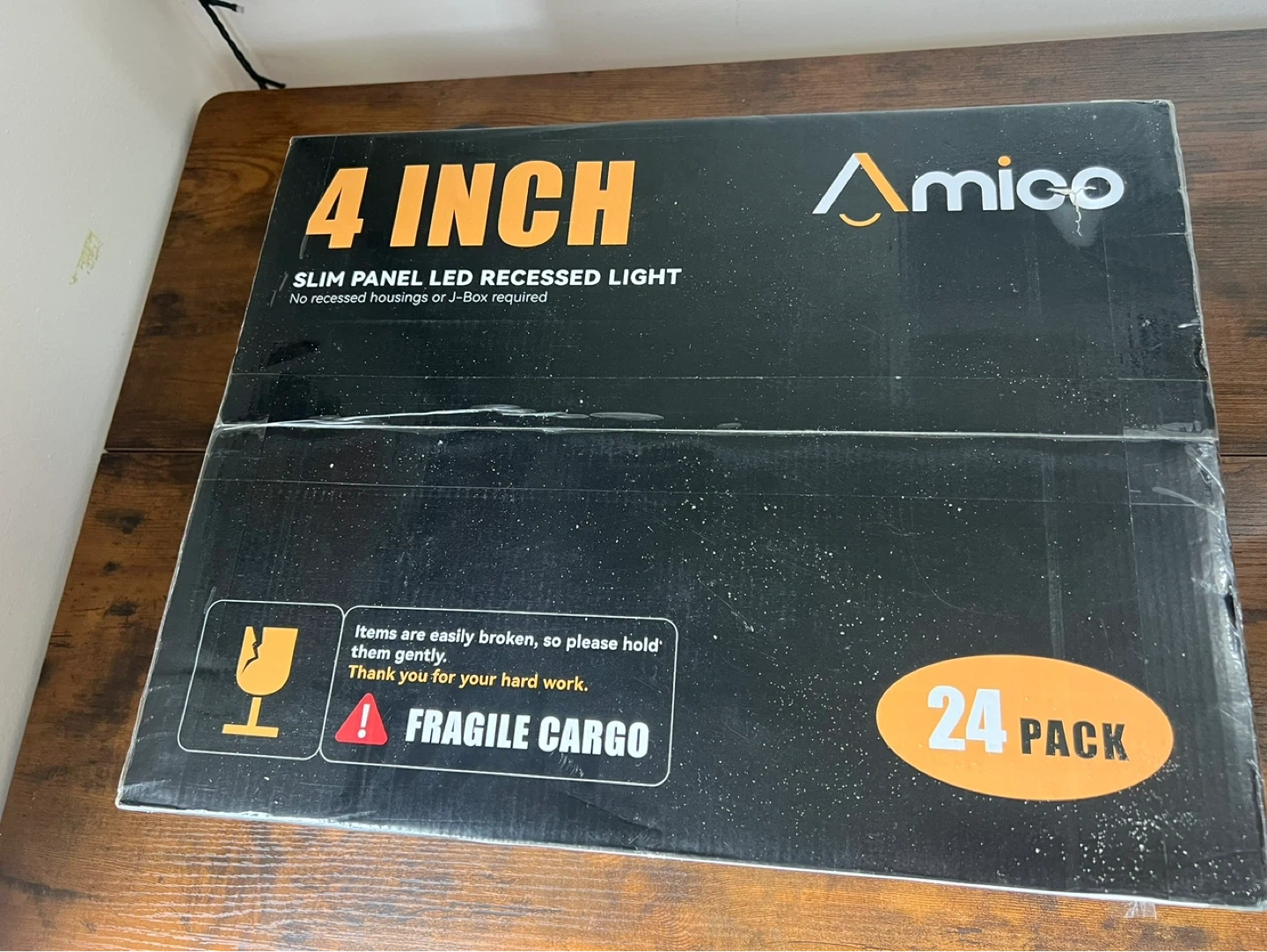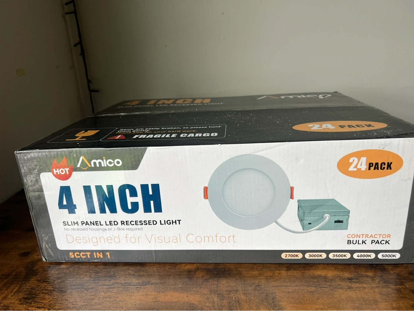 This is a 24 pack of Amico 4 inch slim panel LED recessed lights. They're designed for visual comfort with no recessed housings or J-box required. Contractor bulk pack includes 5CCT in 1.