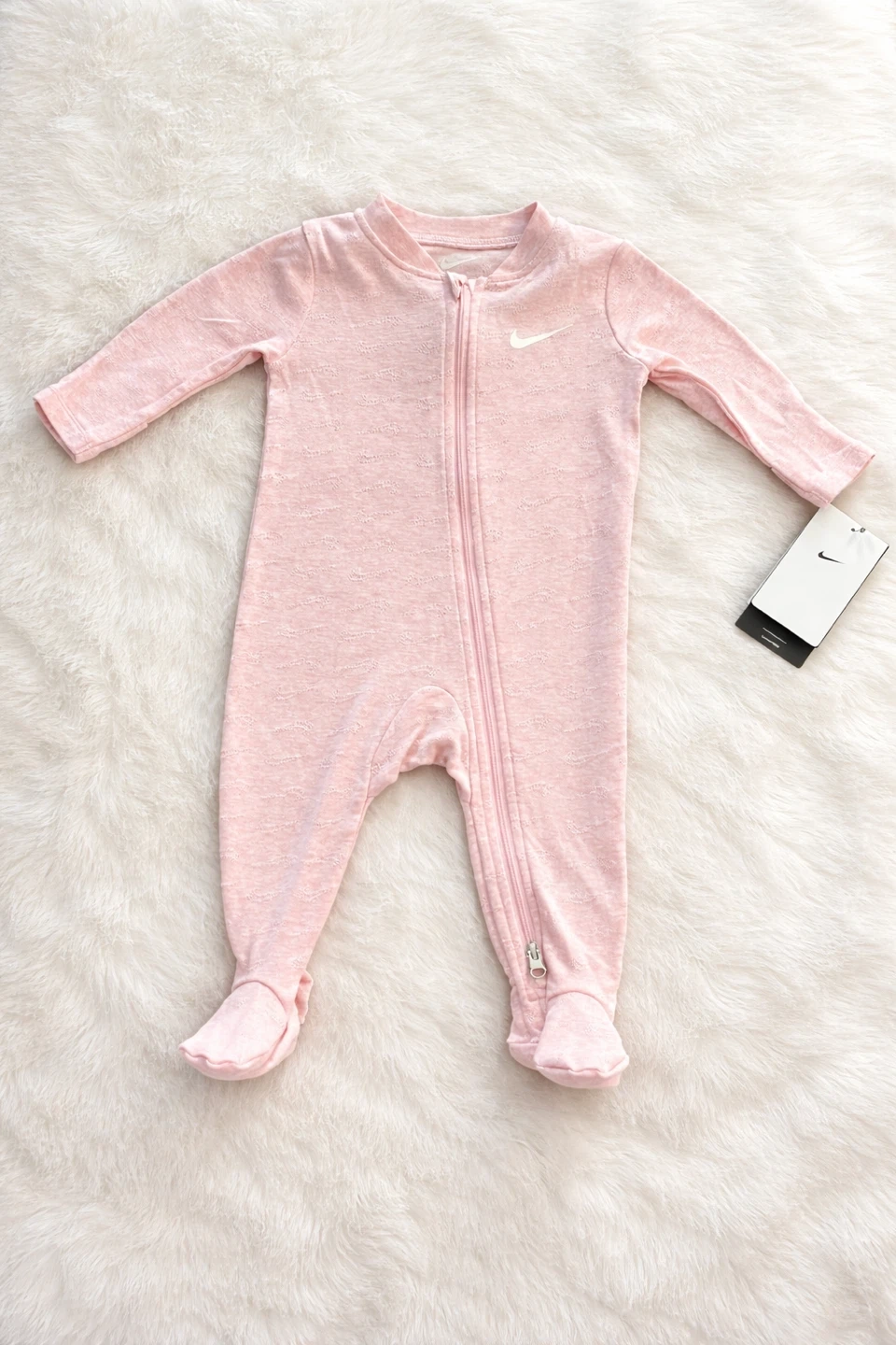 A cute and comfy baby sleeper from Nike! This sleeper is a soft pink colour and size 6M (62-68 cm). It's made of 60% cotton and 40% polyester, perfect for your little one's delicate skin. The sleeper features a convenient zipper down the front for easy changes