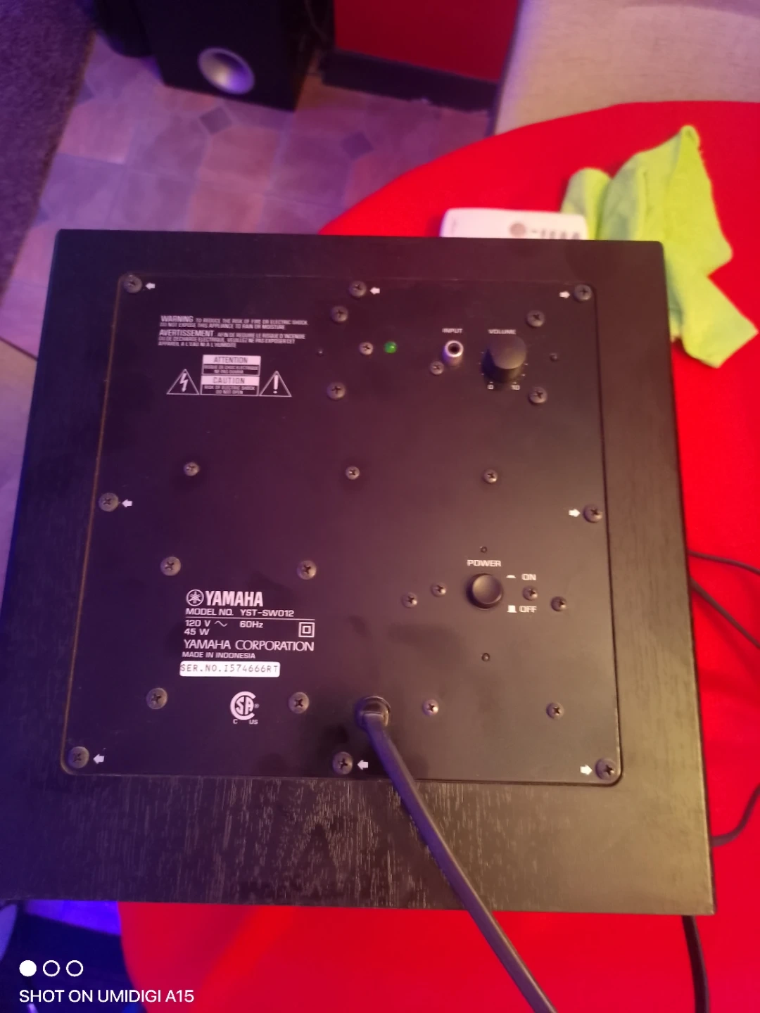 Yamaha powered subwoofer, model YST-SW012. It's a black, wood-grain finish speaker. Perfect for enhancing your home audio experience!