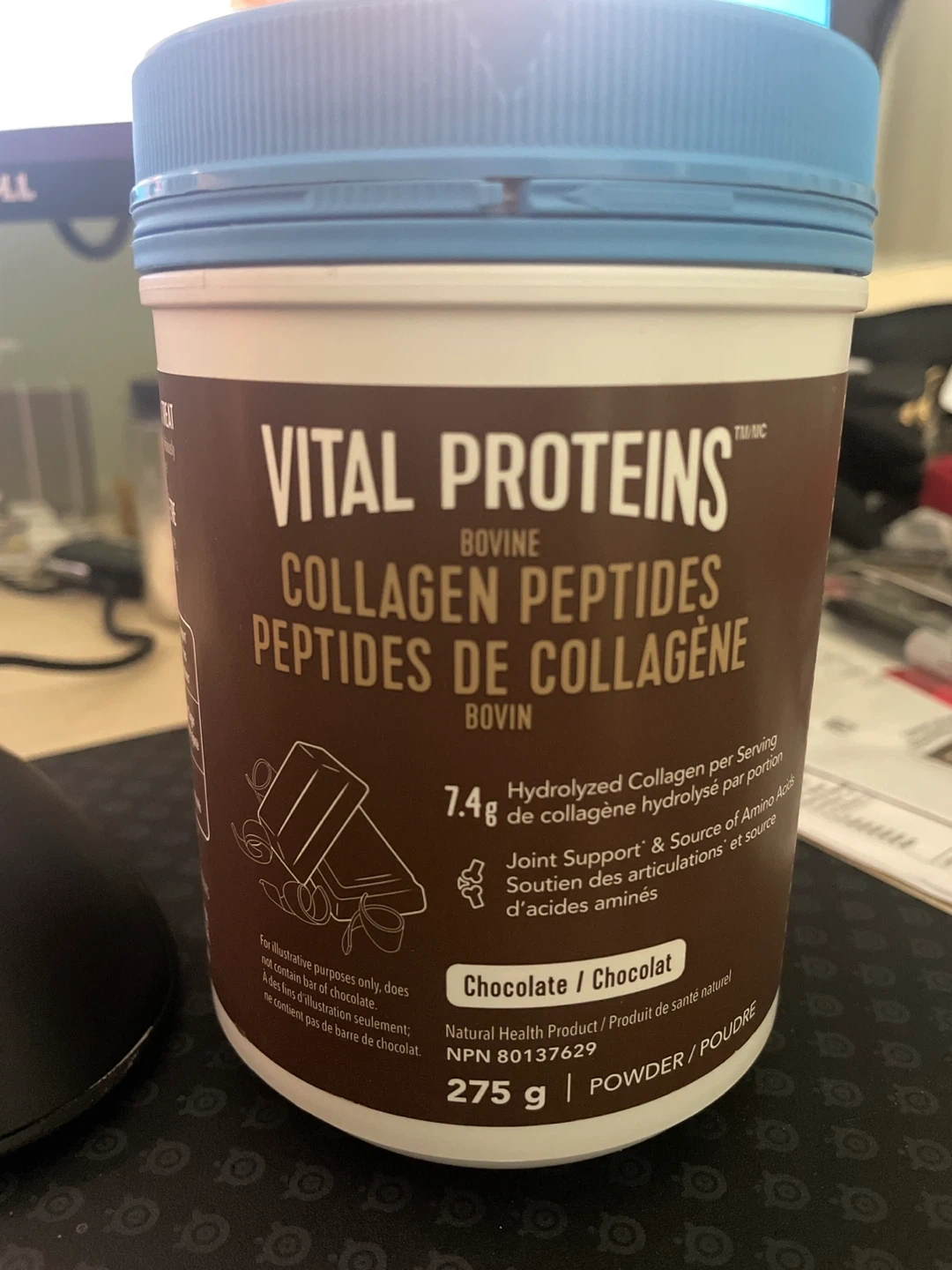 This is Vital Proteins Bovine Collagen Peptides powder in Chocolate flavour. It contains 7.4g of hydrolyzed collagen per serving. The expiry date is 2027 AL 07. Comes in a 275g container.