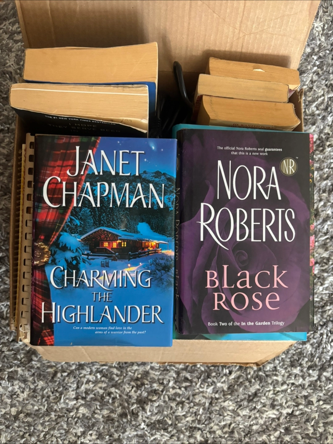 Collection of used paperback romance novels. Includes *Charming the Highlander* by Janet Chapman and *Black Rose* by Nora Roberts. Other titles including a cookbook.