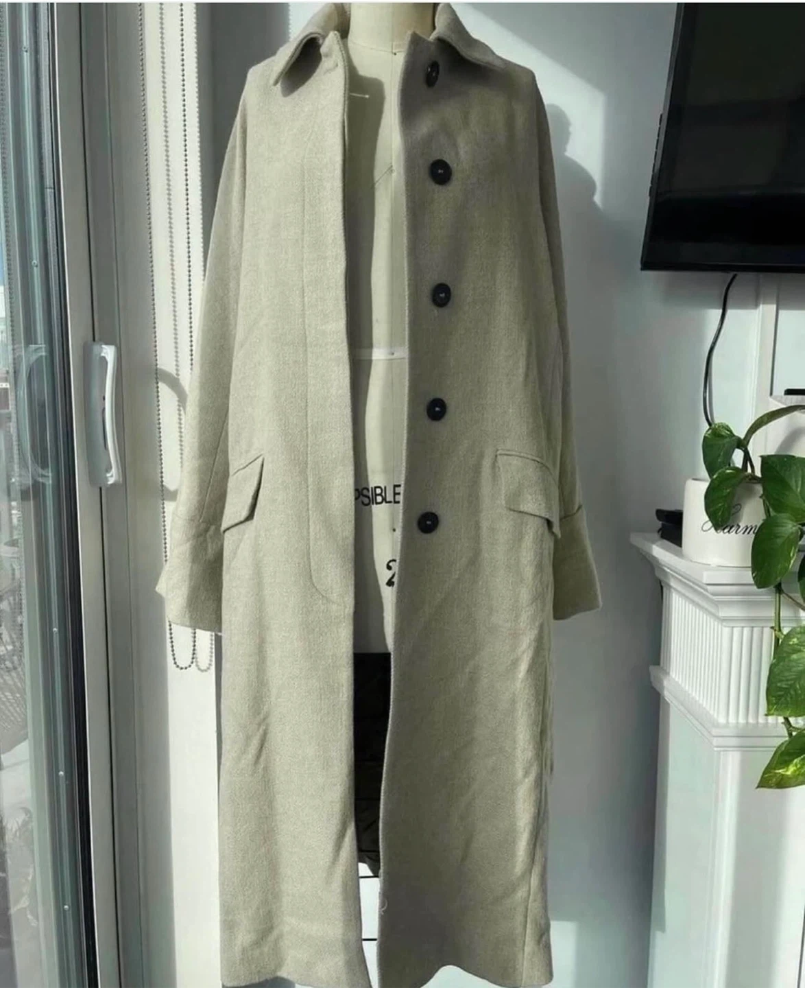 Stylish long beige coat with button closure and two front pockets. It's made of a wool-blend material, perfect for cooler weather. This coat is a versatile addition to any wardrobe!