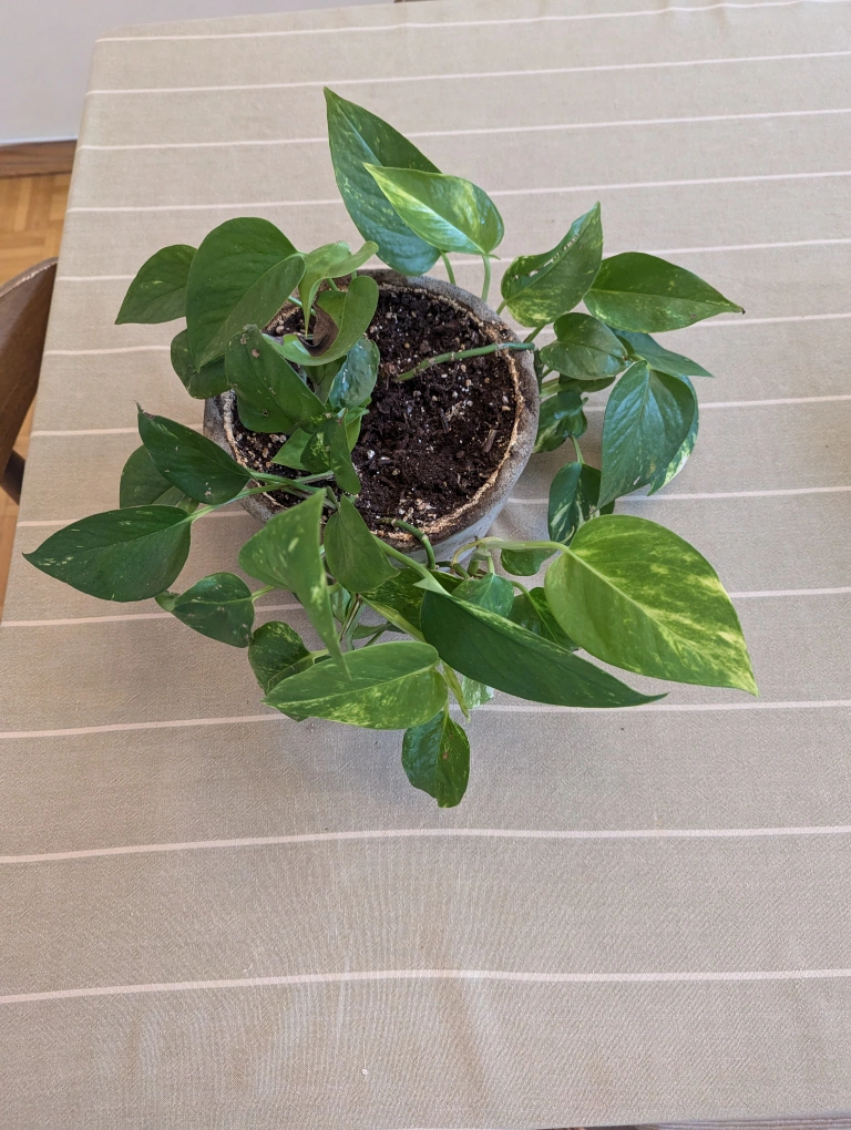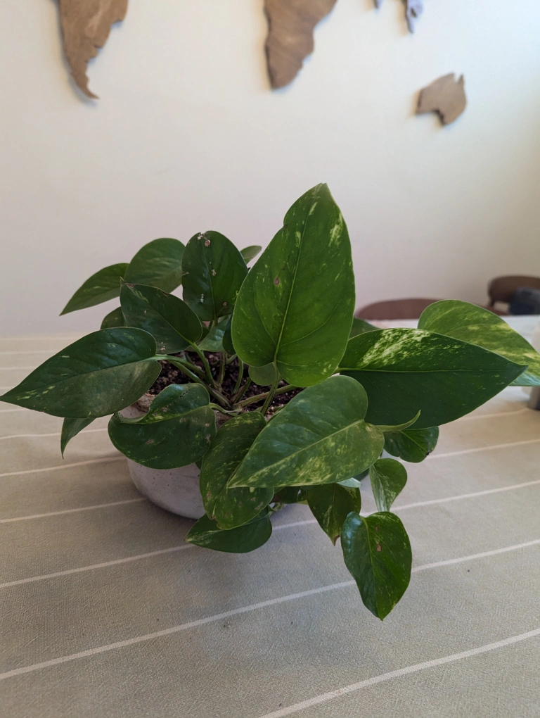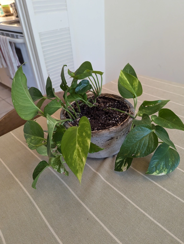 A lovely pothos plant with beautiful green and yellow leaves in a concrete pot. It is a great choice for indoor decoration, and it is easy to care for. The plant is healthy and vibrant, with many leaves and trailing vines. The concrete pot has a unique and stylish look. It is perfect for adding a touch of nature to your home.