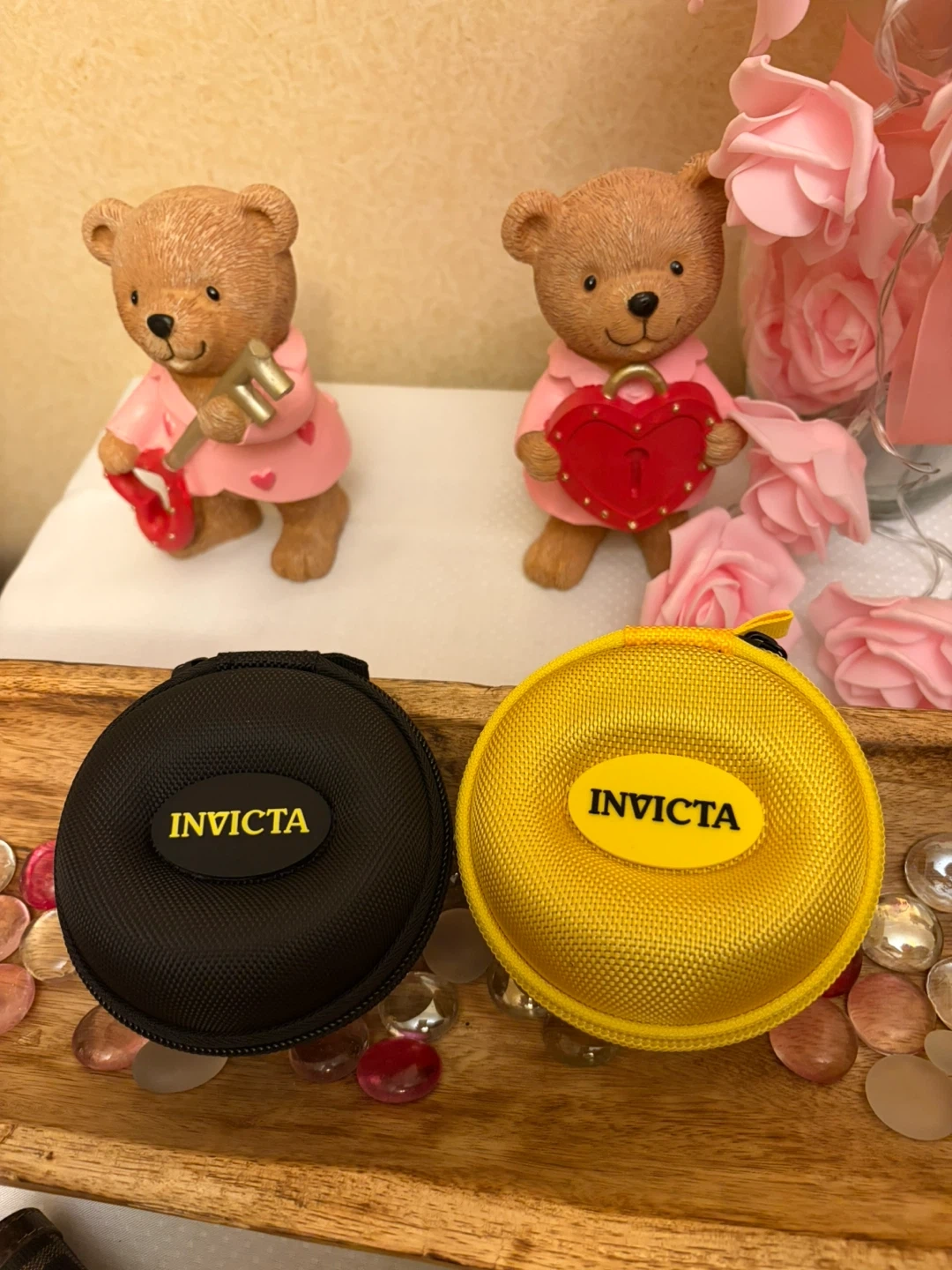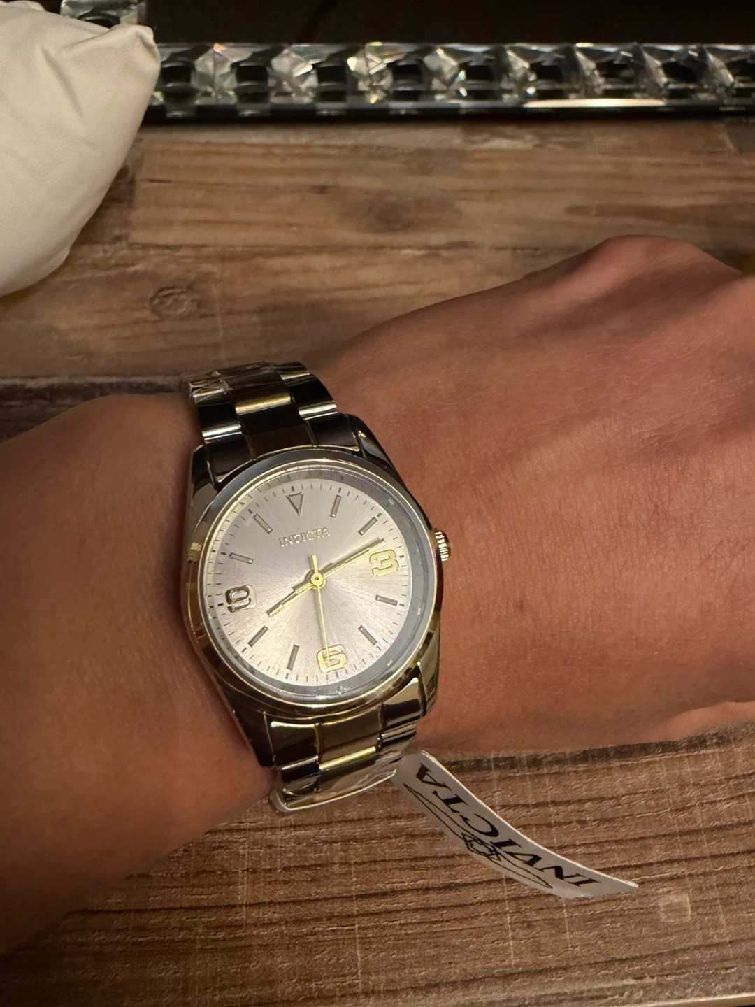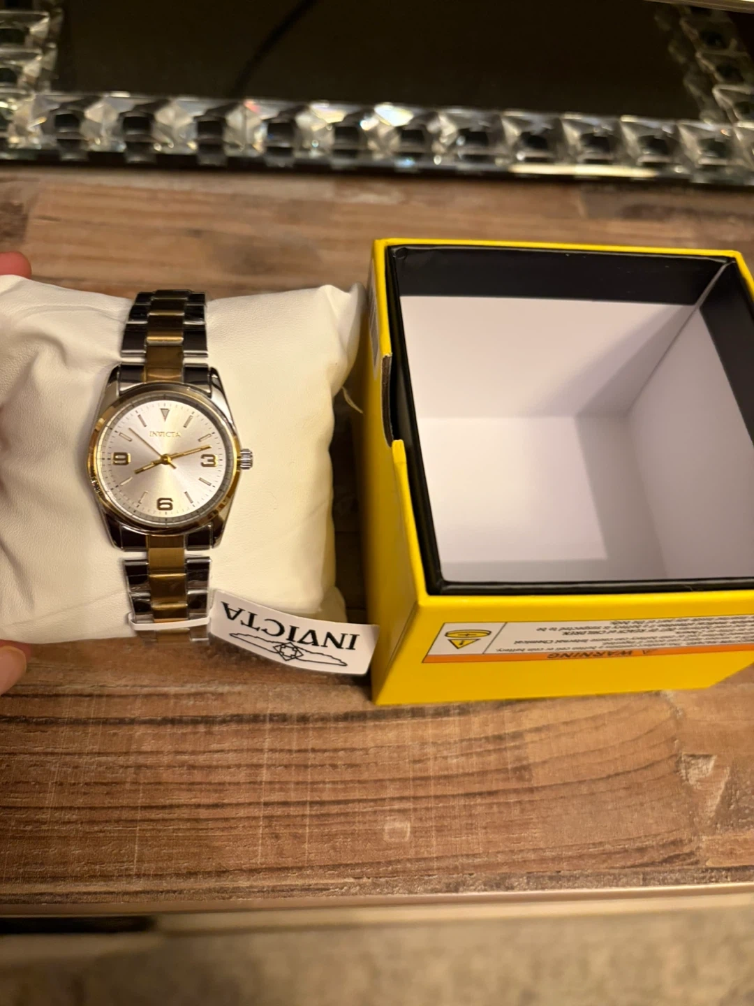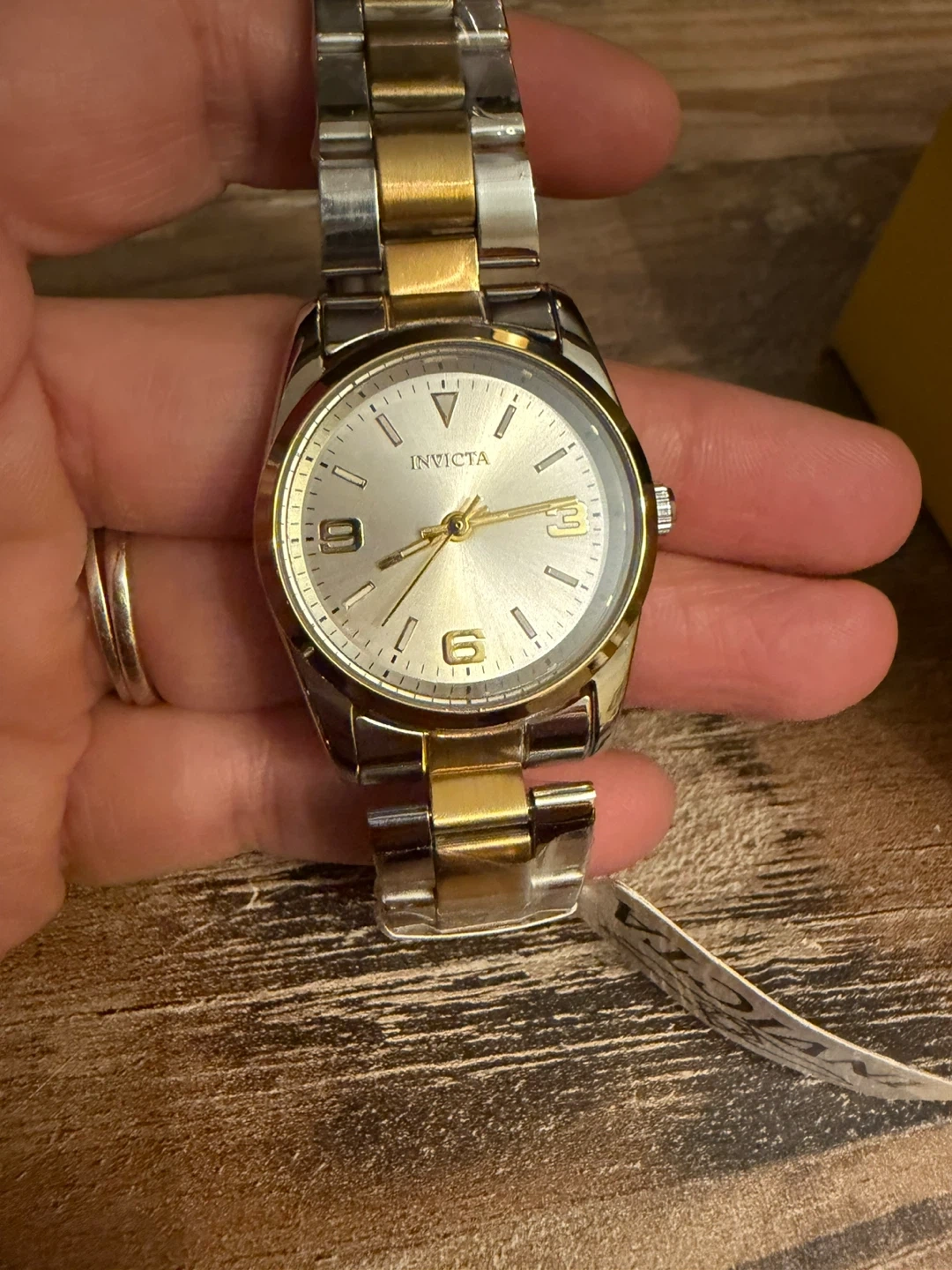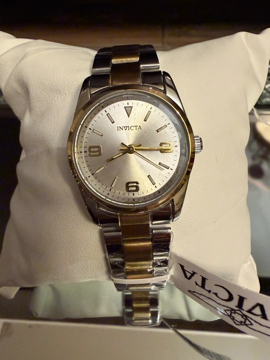 This brand new in box Invicta watch features a two-tone stainless steel band with silver and gold accents. It has a silver dial with gold-tone hour markers and hands. Free gift yellow travel