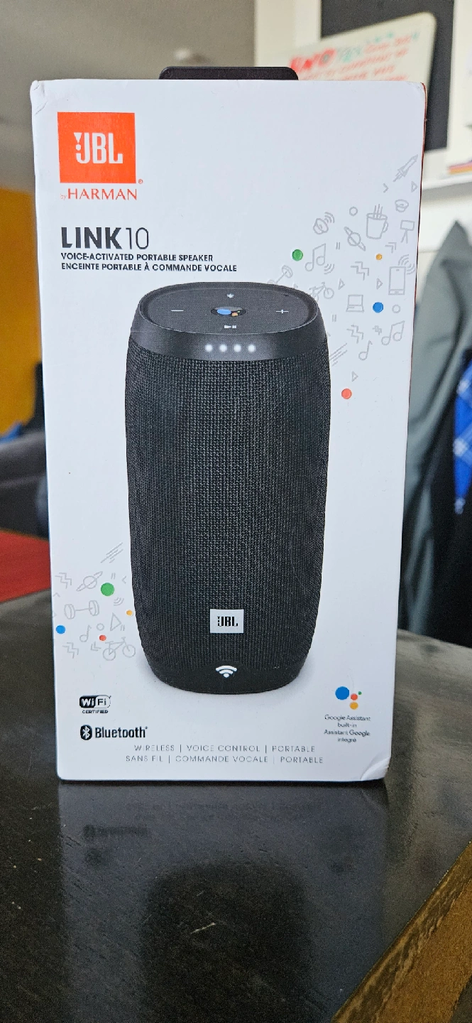 Selling a brand new JBL Link 10 voice-activated portable speaker! It's still in its original box. Key features include: - Get help from your Google Assistant - Hands-free voice control - Simple setup with Google Home app on iOS & Android - Chromecast built-in allows casting from compatible apps - Multi-room playback across speakers that have Chromecast built-in - 2.4/5GHz Wi-Fi support - Bluetooth - 5 hours of playtime - IPX7 waterproof