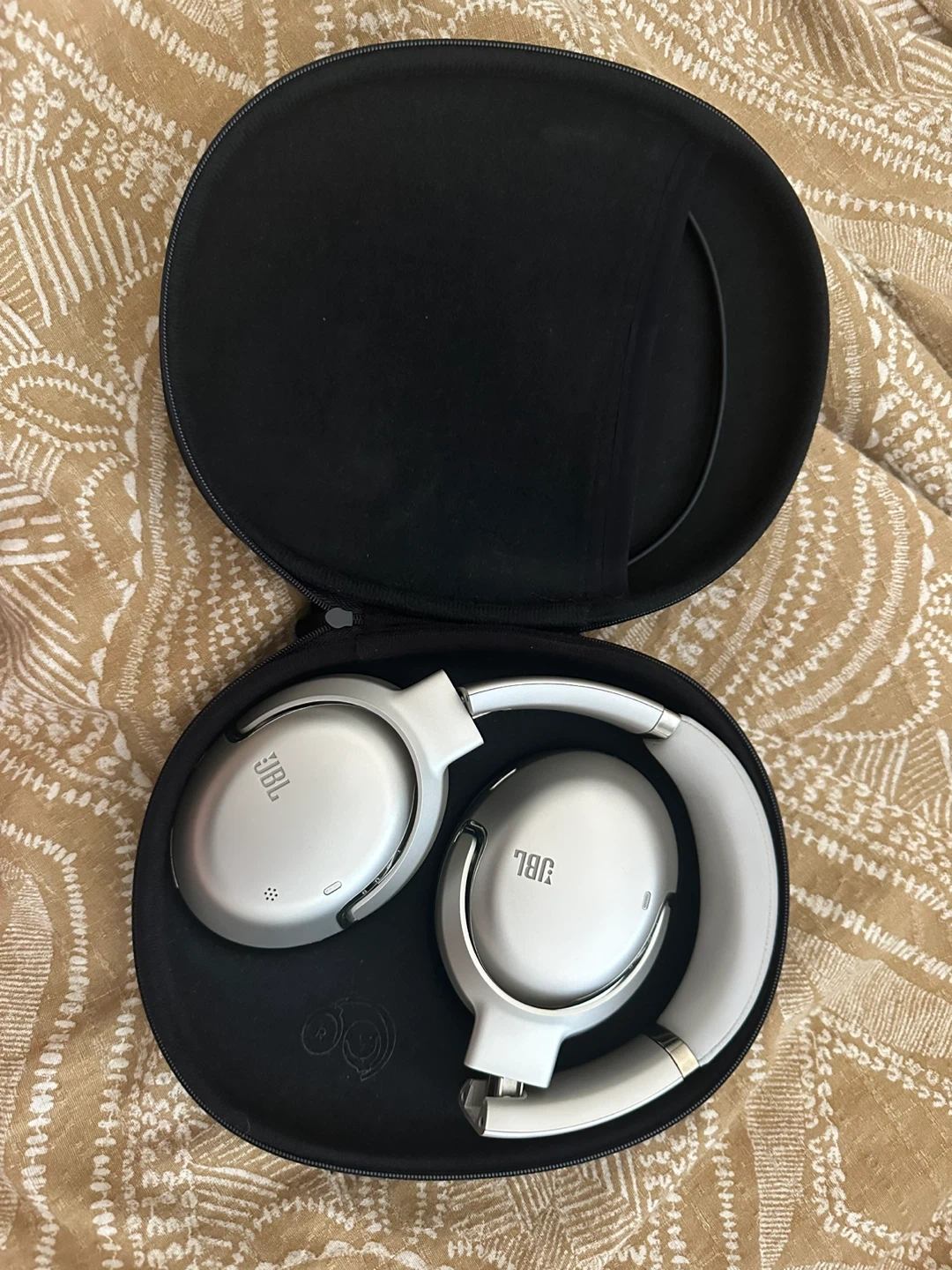 Selling a pair of JBL Tour One headphones in silver! They're in great condition and come with their carrying case. These headphones are known for their excellent sound quality and noise cancellation features, making them perfect for travel or everyday use