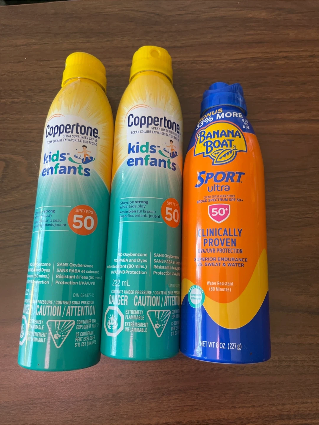 Two Coppertone Kids SPF 50 spray sunscreens (222 mL each) and one Banana Boat Sport Ultra SPF 50 spray sunscreen (8 oz / 227g).